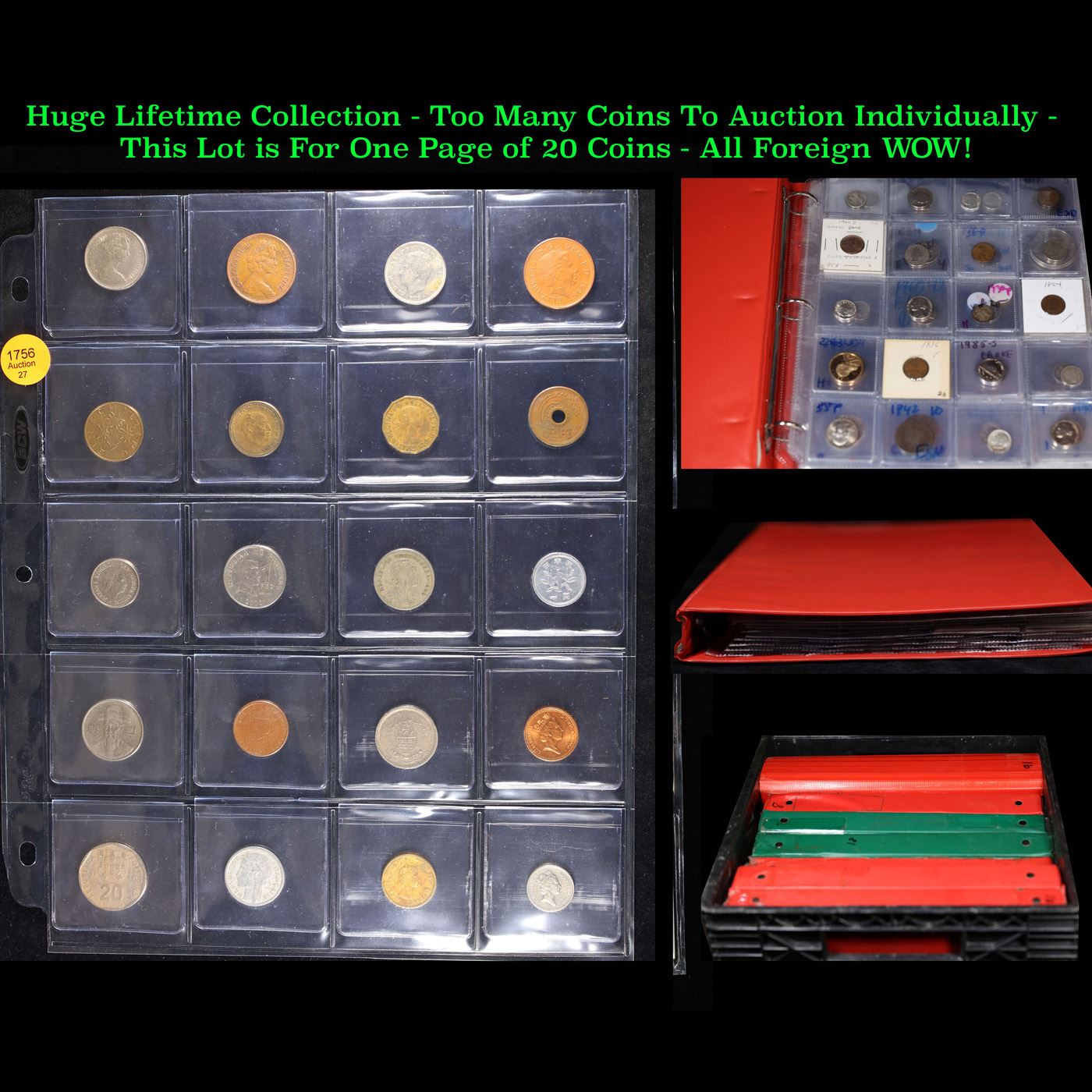 Huge Liifetime Collection - Too Many Coins To Auction Individually - This Lot is For One Page of 20 Foreign Coins. We have received a huge collection of over 10 thousand US coins in flips, 2x2 holders, and 20 coin pages. We are forced, due to limited lots, to sell this collection in pages of 20 coins. All of the pages include Silver Coins. Most contain Indian Cents, Proof Coins, Barber Coinage, Bust Coinage, Lincoln Cents, Flying Eagles, Jefferson Nickels, Roosevelt Dimes, Buffalo Nickels, Eisenhower Dollars, Kennedy Halves, Large Cents including some Draped Bust Large Cents, Mercury Dimes, and Liberty V Nickels. These pages could not be reviewed by anyone in our office due to time constraints. We estimate the value of each page to meet or exceed $200 in value! Good luck and happy hunting.