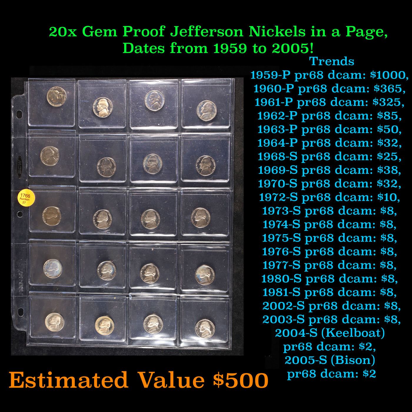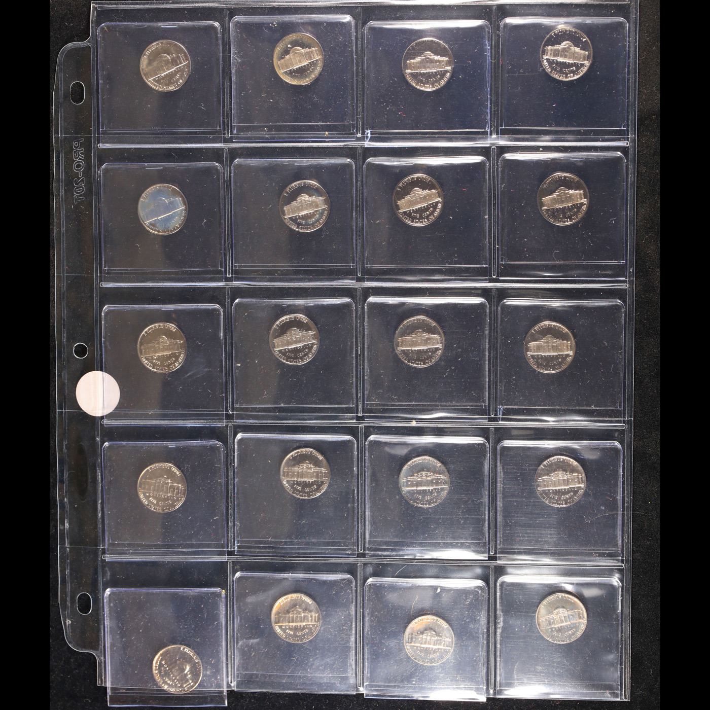 Huge Liifetime Collection - Too Many Coins To Auction Individually - This Lot is For One Page of 20 Proof Jefferson Nickels Dates Range From 1971-2006. We have received a huge collection of over 10 thousand US coins in flips, 2x2 holders, and 20 coin pages. We are forced, due to limited lots, to sell this collection in pages of 20 coins. This Page is For 20 Proof Jefferson Nickels. Trends 1987-s pr69 DCAM $15, 1980-s pr69 DCAM $10, 2006-s pr69 DCAM $15, 1985-s pr69 DCAM $15, 1972-s pr69 DCAM $36, 2002-s pr69 DCAM $15, 1971-s pr69 DCAM $200, 2006-s pr69 DCAM $15, 1981-s pr69 DCAM $20, 1983-s pr69 DCAM $15, 1992-s pr69 DCAM $15, 1992-s pr69 DCAM $15, 1980-s pr69 DCAM $10, 1980-s pr69 DCAM $10, 2001-s pr69 DCAM $15, 1981-s pr69 DCAM $20, 1993-s pr69 DCAM $15, 1985-s pr69 DCAM $15, 1991-s pr69 DCAM $15, 1980-s pr69 DCAM $10. We estimate the value of each page to meet or exceed $200 in value! Good luck and happy hunting.