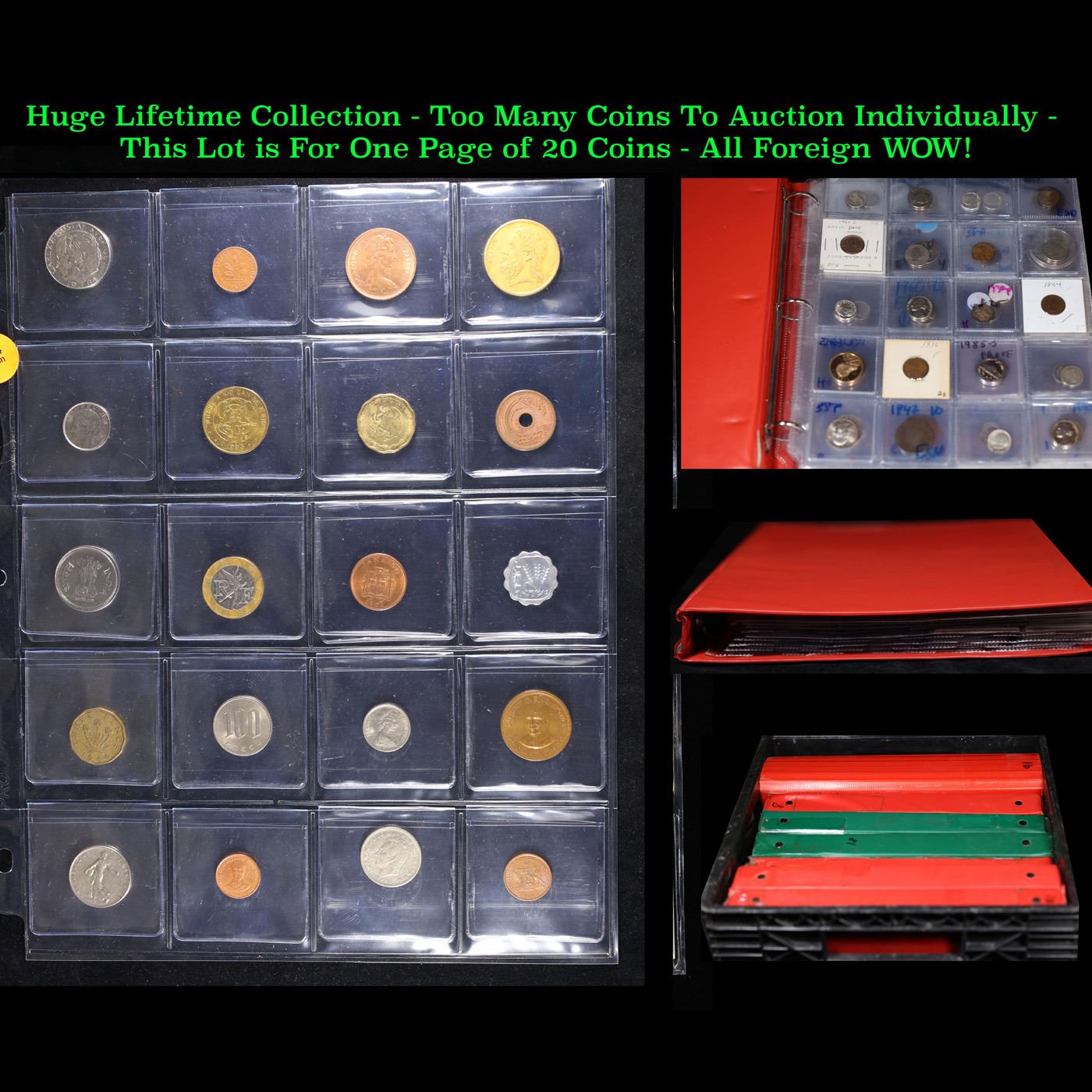 Huge Liifetime Collection - Too Many Coins To Auction Individually - This Lot is For One Page of 20 Foreign Coins. We have received a huge collection of over 10 thousand US coins in flips, 2x2 holders, and 20 coin pages. We are forced, due to limited lots, to sell this collection in pages of 20 coins. All of the pages include Silver Coins. Most contain Indian Cents, Proof Coins, Barber Coinage, Bust Coinage, Lincoln Cents, Flying Eagles, Jefferson Nickels, Roosevelt Dimes, Buffalo Nickels, Eisenhower Dollars, Kennedy Halves, Large Cents including some Draped Bust Large Cents, Mercury Dimes, and Liberty V Nickels. These pages could not be reviewed by anyone in our office due to time constraints. We estimate the value of each page to meet or exceed $200 in value! Good luck and happy hunting.