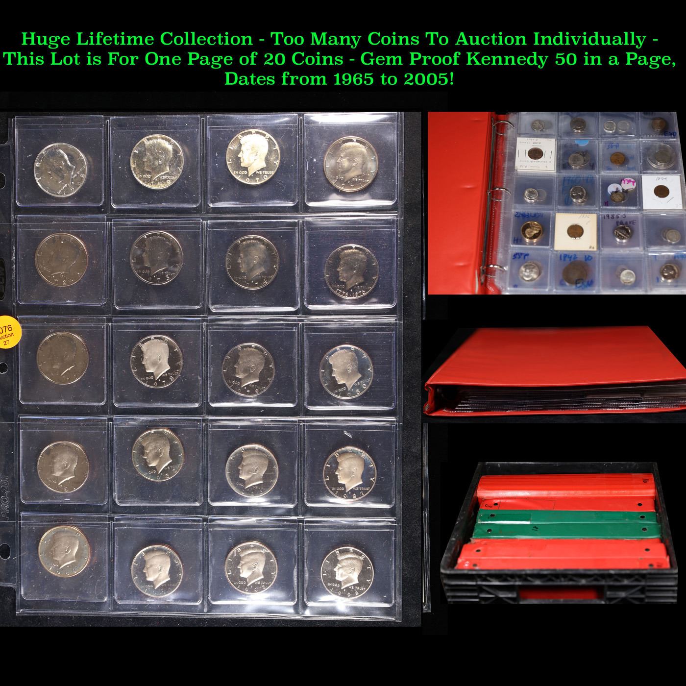 Huge Liifetime Collection - Too Many Coins To Auction Individually - This Lot is For One Page of 20 Proof Kennedy Half Dollars Dates Range From 1968-2006. We have received a huge collection of over 10 thousand US coins in flips, 2x2 holders, and 20 coin pages. We are forced, due to limited lots, to sell this collection in pages of 20 coins. This Page is For 20 Proof Kennedy Half Dollars. Trends 1983-s pr69 DCAM $16, 1981-s pr69 DCAM $50, 1980-s pr69 DCAM $16, 1972-s pr69 DCAM $60, 1970-s pr69 DCAM $350, 1990-s pr69 DCAM $16, 1989-s pr69 DCAM $14, 1987-s pr69 DCAM $16, 1998-s pr69 DCAM $16, 1974-s pr69 DCAM $17, 1973-s pr69 DCAM $20, 1968-s pr69 DCAM $250, 2006-s pr69 DCAM $12, 2003-s pr69 DCAM $16, 2002-s pr69 DCAM $16, 2000-s pr69 DCAM $12, 1996-s pr69 DCAM $14, 1985-s pr69 DCAM $16, 1986-s pr69 DCAM $16, 1999-s pr69 DCAM $16. We estimate the value of each page to meet or exceed $200 in value! Good luck and happy hunting.