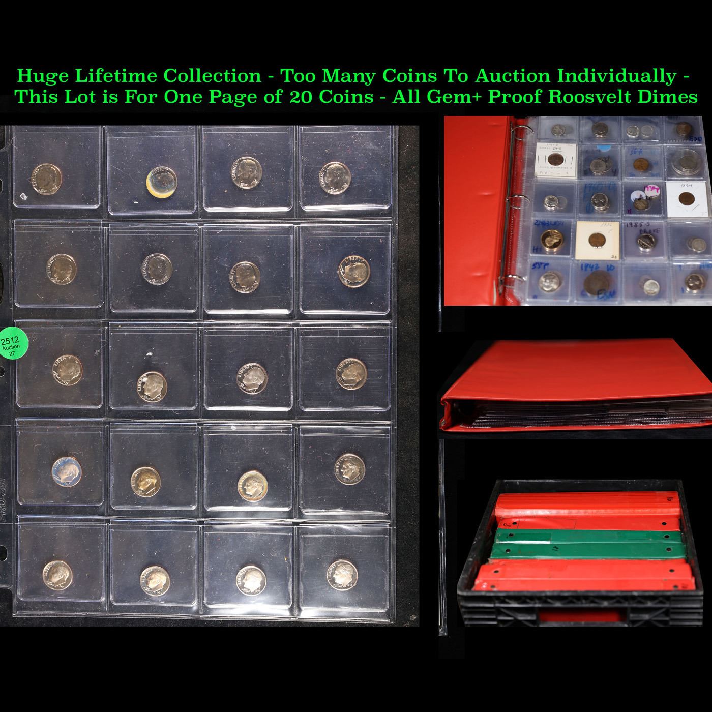 Huge Liifetime Collection - Too Many Coins To Auction Individually - This Lot is For One Page of 20 Proof Roosevelt Dimes Dates Range From 1970-2006. We have received a huge collection of over 10 thousand US coins in flips, 2x2 holders, and 20 coin pages. We are forced, due to limited lots, to sell this collection in pages of 20 coins. This Page is For 20 Proof Roosevelt Dimes. Trends 1981-s pr69 DCAM $38, 1980-s pr69 DCAM $16, 1972-s pr69 DCAM $24, 1971-s pr69 DCAM $115, 1987-s pr69 DCAM $16, 1984-s pr69 DCAM $16, 1983-s pr69 DCAM $16, 1982-s pr69 DCAM $16, 1992-s pr69 DCAM $16, 2000-s pr69 DCAM $16, 1990-s pr69 DCAM $16, 1988-s pr69 DCAM $16, 2006-s pr69 DCAM $16, 2003-s pr69 DCAM $16, 1976-s pr69 DCAM $15, 2002-s pr69 DCAM $16, 1997-s pr69 DCAM $16, 1998-s pr69 DCAM $16, 1970-s pr69 DCAM $75, 1996-s pr69 DCAM $16. We estimate the value of each page to meet or exceed $200 in value! Good luck and happy hunting.