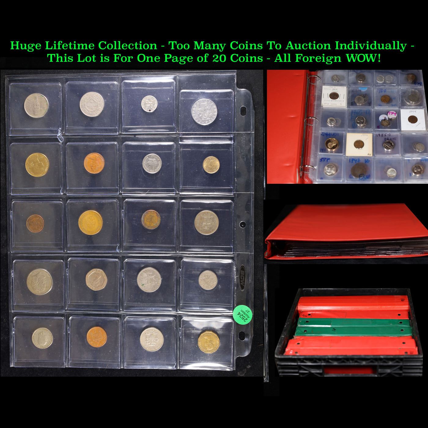 Huge Liifetime Collection - Too Many Coins To Auction Individually - This Lot is For One Page of 20 Foreign Coins. We have received a huge collection of over 10 thousand US coins in flips, 2x2 holders, and 20 coin pages. We are forced, due to limited lots, to sell this collection in pages of 20 coins. All of the pages include Silver Coins. Most contain Indian Cents, Proof Coins, Barber Coinage, Bust Coinage, Lincoln Cents, Flying Eagles, Jefferson Nickels, Roosevelt Dimes, Buffalo Nickels, Eisenhower Dollars, Kennedy Halves, Large Cents including some Draped Bust Large Cents, Mercury Dimes, and Liberty V Nickels. These pages could not be reviewed by anyone in our office due to time constraints. We estimate the value of each page to meet or exceed $200 in value! Good luck and happy hunting.