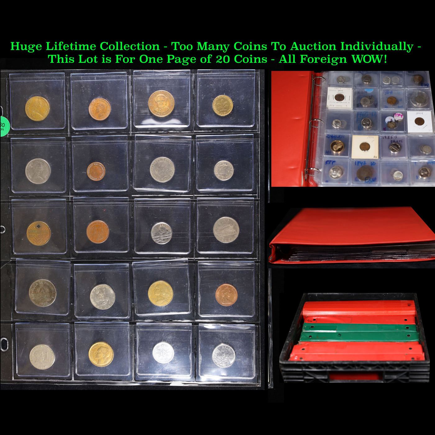 Huge Liifetime Collection - Too Many Coins To Auction Individually - This Lot is For One Page of 20 Foreign Coins. We have received a huge collection of over 10 thousand US coins in flips, 2x2 holders, and 20 coin pages. We are forced, due to limited lots, to sell this collection in pages of 20 coins. All of the pages include Silver Coins. Most contain Indian Cents, Proof Coins, Barber Coinage, Bust Coinage, Lincoln Cents, Flying Eagles, Jefferson Nickels, Roosevelt Dimes, Buffalo Nickels, Eisenhower Dollars, Kennedy Halves, Large Cents including some Draped Bust Large Cents, Mercury Dimes, and Liberty V Nickels. These pages could not be reviewed by anyone in our office due to time constraints. We estimate the value of each page to meet or exceed $200 in value! Good luck and happy hunting.