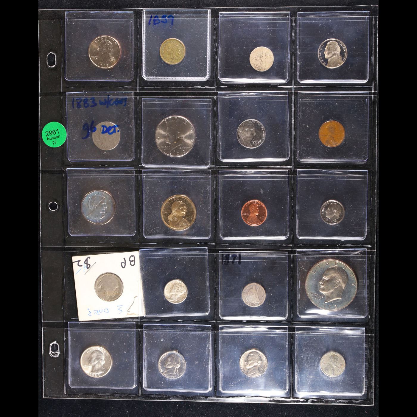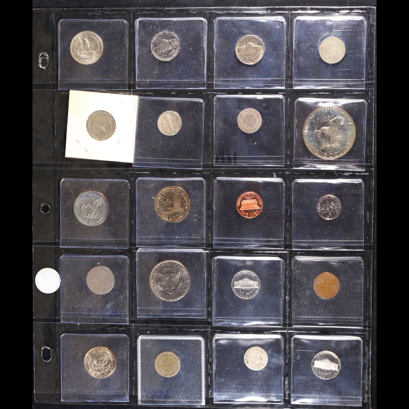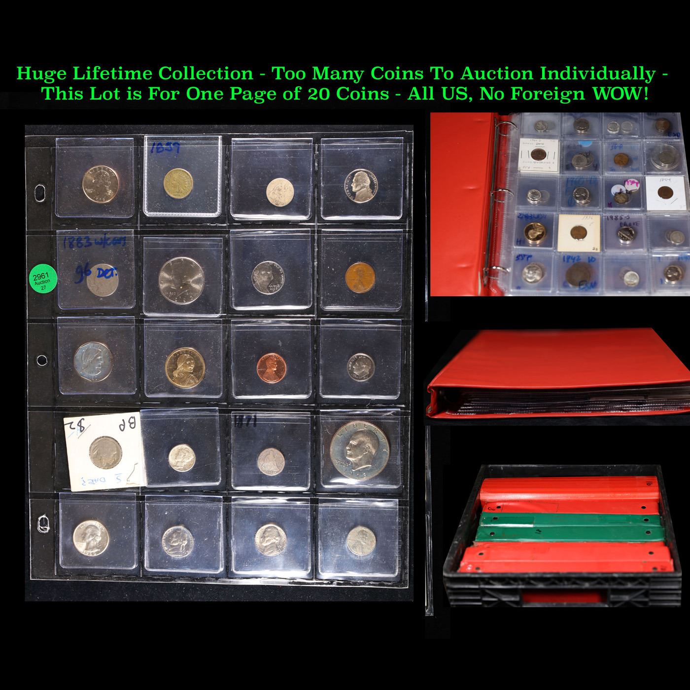 Huge Liifetime Collection - Too Many Coins To Auction Individually - This Lot is For One Page of 20 Coins - All US, No Foreign WOW!. We have received a huge collection of over 10 thousand US coins in flips, 2x2 holders, and 20 coin pages. We are forced, due to limited lots, to sell this collection in pages of 20 coins. All of the pages include Silver Coins. Most contain Indian Cents, Proof Coins, Barber Coinage, Bust Coinage, Lincoln Cents, Flying Eagles, Jefferson Nickels, Roosevelt Dimes, Buffalo Nickels, Eisenhower Dollars, Kennedy Halves, Large Cents including some Draped Bust Large Cents, Mercury Dimes, and Liberty V Nickels. These pages could not be reviewed by anyone in our office due to time constraints. We estimate the value of each page to meet or exceed $200 in value! Good luck and happy hunting.