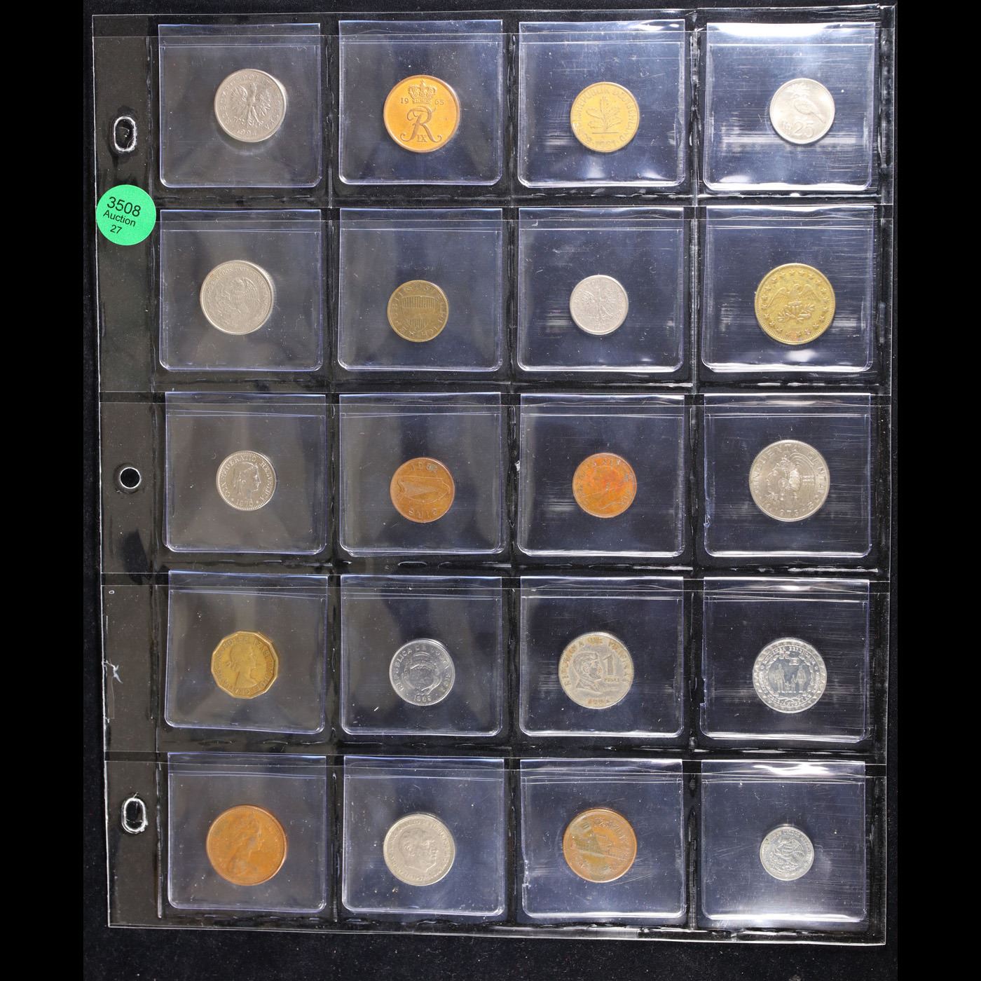 Huge Liifetime Collection - Too Many Coins To Auction Individually - This Lot is For One Page of 20 Foreign Coins. We have received a huge collection of over 10 thousand US coins in flips, 2x2 holders, and 20 coin pages. We are forced, due to limited lots, to sell this collection in pages of 20 coins. All of the pages include Silver Coins. Most contain Indian Cents, Proof Coins, Barber Coinage, Bust Coinage, Lincoln Cents, Flying Eagles, Jefferson Nickels, Roosevelt Dimes, Buffalo Nickels, Eisenhower Dollars, Kennedy Halves, Large Cents including some Draped Bust Large Cents, Mercury Dimes, and Liberty V Nickels. These pages could not be reviewed by anyone in our office due to time constraints. We estimate the value of each page to meet or exceed $200 in value! Good luck and happy hunting.