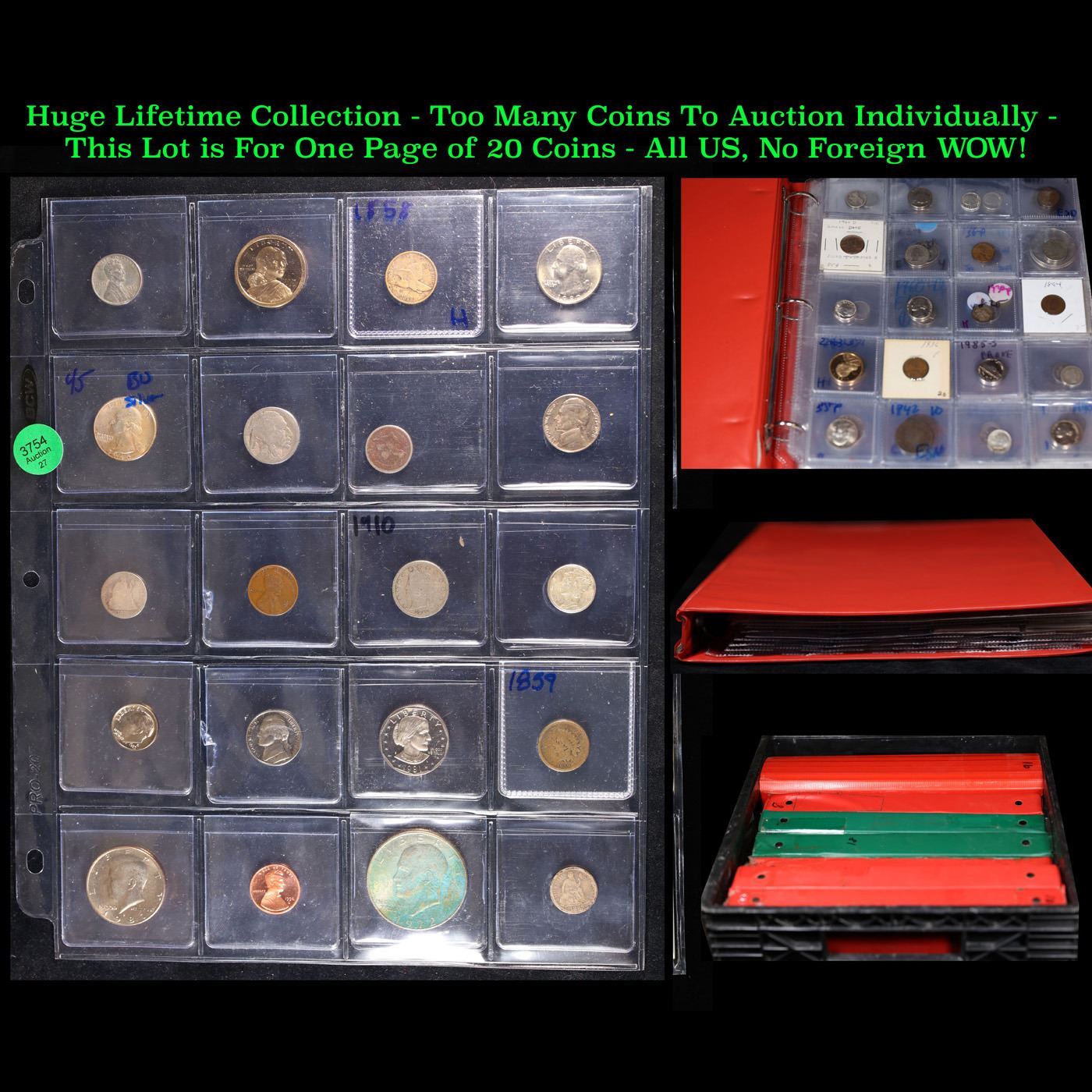 Huge Liifetime Collection - Too Many Coins To Auction Individually - This Lot is For One Page of 20 Coins - All US, No Foreign WOW!. We have received a huge collection of over 10 thousand US coins in flips, 2x2 holders, and 20 coin pages. We are forced, due to limited lots, to sell this collection in pages of 20 coins. All of the pages include Silver Coins. Most contain Indian Cents, Proof Coins, Barber Coinage, Bust Coinage, Lincoln Cents, Flying Eagles, Jefferson Nickels, Roosevelt Dimes, Buffalo Nickels, Eisenhower Dollars, Kennedy Halves, Large Cents including some Draped Bust Large Cents, Mercury Dimes, and Liberty V Nickels. These pages could not be reviewed by anyone in our office due to time constraints. We estimate the value of each page to meet or exceed $200 in value! Good luck and happy hunting.