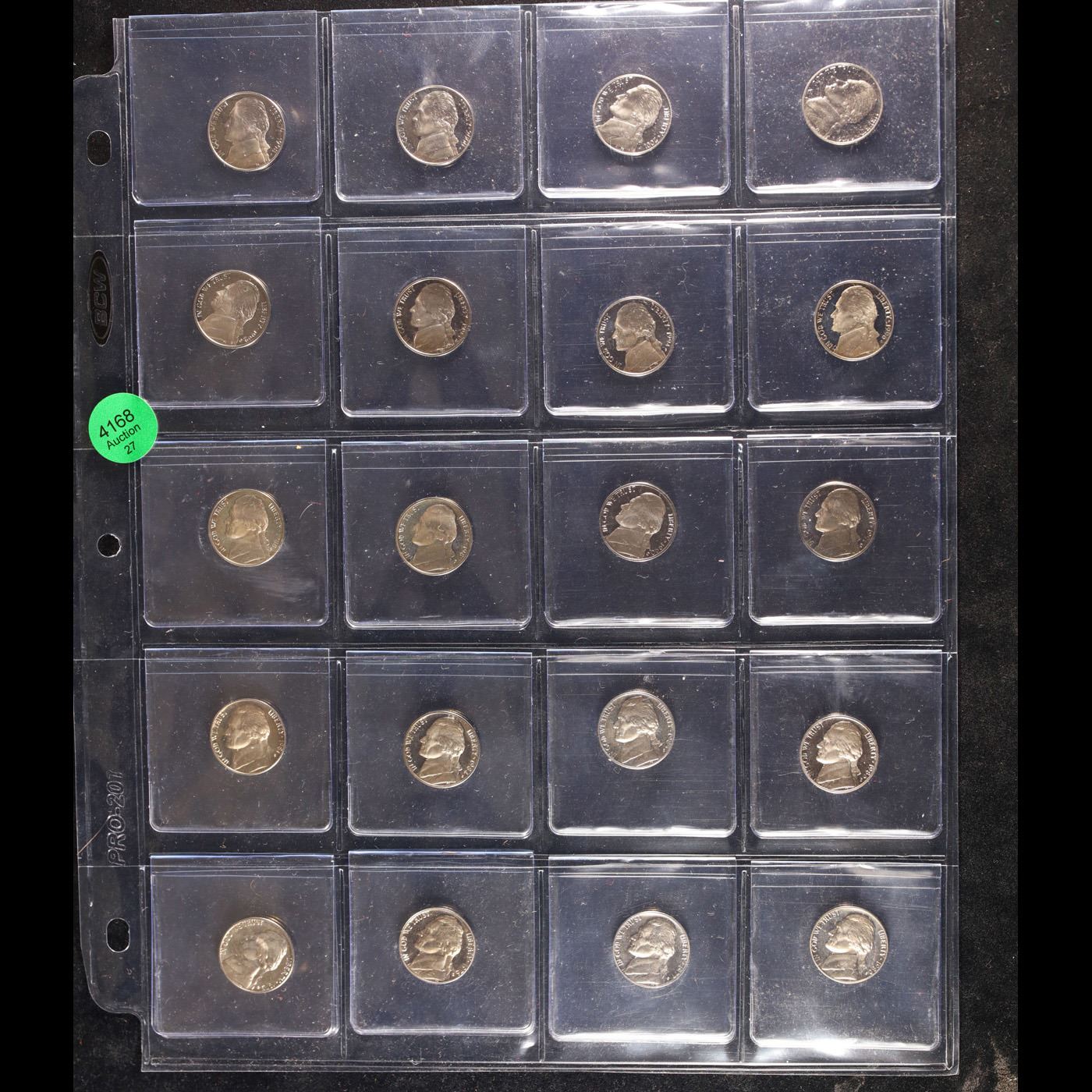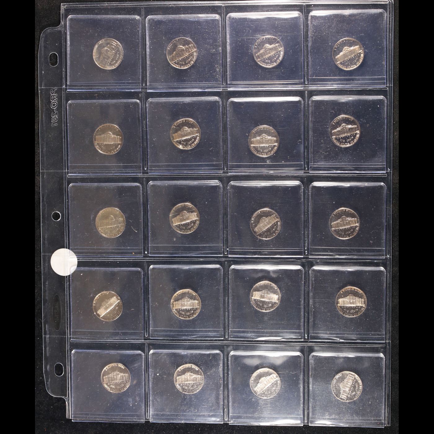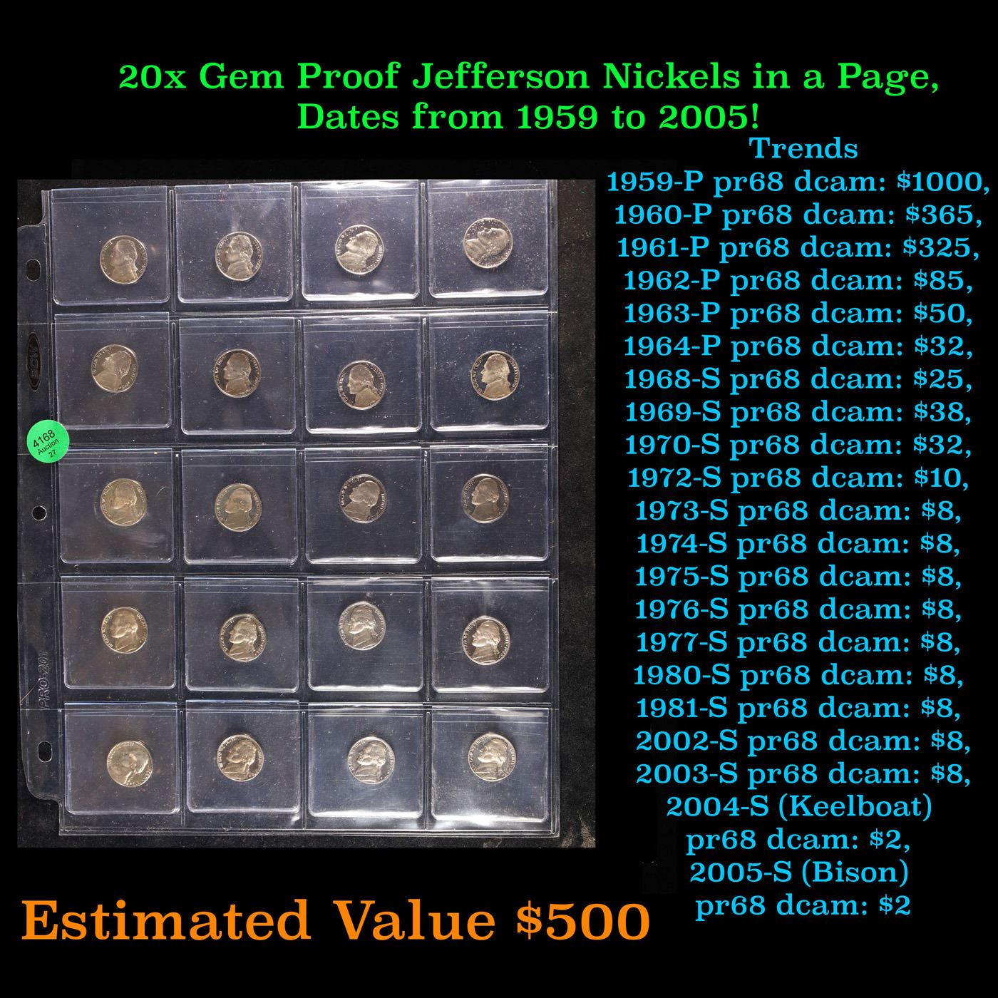 Huge Liifetime Collection - Too Many Coins To Auction Individually - This Lot is For One Page of 20 Proof Jefferson Nickels Dates Range From 1971-2006. We have received a huge collection of over 10 thousand US coins in flips, 2x2 holders, and 20 coin pages. We are forced, due to limited lots, to sell this collection in pages of 20 coins. This Page is For 20 Proof Jefferson Nickels. Trends 1987-s pr69 DCAM $15, 1980-s pr69 DCAM $10, 2006-s pr69 DCAM $15, 1985-s pr69 DCAM $15, 1972-s pr69 DCAM $36, 2002-s pr69 DCAM $15, 1971-s pr69 DCAM $200, 2006-s pr69 DCAM $15, 1981-s pr69 DCAM $20, 1983-s pr69 DCAM $15, 1992-s pr69 DCAM $15, 1992-s pr69 DCAM $15, 1980-s pr69 DCAM $10, 1980-s pr69 DCAM $10, 2001-s pr69 DCAM $15, 1981-s pr69 DCAM $20, 1993-s pr69 DCAM $15, 1985-s pr69 DCAM $15, 1991-s pr69 DCAM $15, 1980-s pr69 DCAM $10. We estimate the value of each page to meet or exceed $200 in value! Good luck and happy hunting.