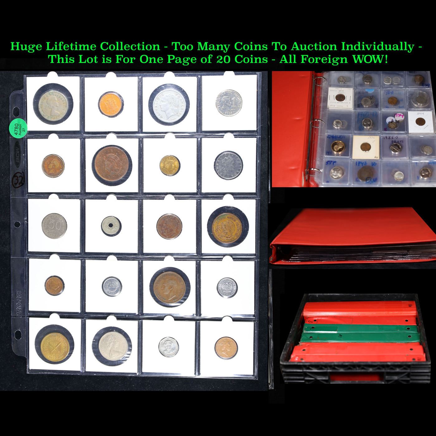 Huge Liifetime Collection - Too Many Coins To Auction Individually - This Lot is For One Page of 20 Foreign Coins. We have received a huge collection of over 10 thousand US coins in flips, 2x2 holders, and 20 coin pages. We are forced, due to limited lots, to sell this collection in pages of 20 coins. All of the pages include Silver Coins. Most contain Indian Cents, Proof Coins, Barber Coinage, Bust Coinage, Lincoln Cents, Flying Eagles, Jefferson Nickels, Roosevelt Dimes, Buffalo Nickels, Eisenhower Dollars, Kennedy Halves, Large Cents including some Draped Bust Large Cents, Mercury Dimes, and Liberty V Nickels. These pages could not be reviewed by anyone in our office due to time constraints. We estimate the value of each page to meet or exceed $200 in value! Good luck and happy hunting.