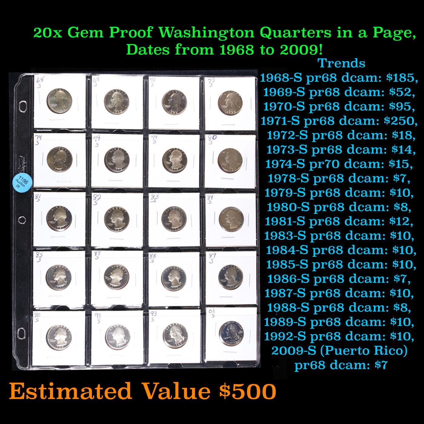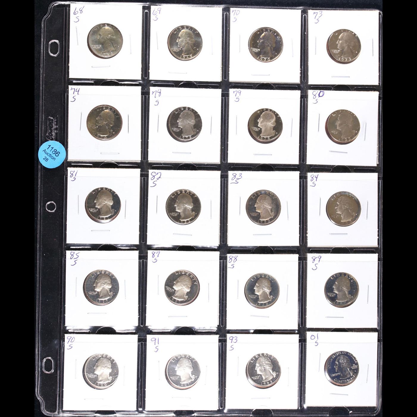 Huge Liifetime Collection - Too Many Coins To Auction Individually - This Lot is For One Page of 20 Proof Washington Quarters Dates Range From 1982-2006. We have received a huge collection of over 10 thousand US coins in flips, 2x2 holders, and 20 coin pages. We are forced, due to limited lots, to sell this collection in pages of 20 coins. This Page is For 20 Proof Washington Quarters Trends 2002-s pr69 DCAM $19 1994-s pr69 DCAM $16, 1982-s pr69 DCAM $15, 2002-s pr69 DCAM $19, 2006-s pr69 DCAM $19, 2003-s pr69 DCAM $19, 2003-s pr69 DCAM $19, 2002-s pr69 DCAM $19, 1993-s pr69 DCAM $16, 1982-s pr69 DCAM $15, 1991-s pr69 DCAM $16, 1982-s pr69 DCAM $15, 1990-s pr69 DCAM $16, 1983-s pr69 DCAM $16, 1985-s pr69 DCAM $16, 1987-s pr69 DCAM $16, 1996-s pr69 DCAM $16, 1993-s pr69 DCAM $16, 1983-s pr69 DCAM $16, 1984-s pr69 DCAM $16. We estimate the value of each page to meet or exceed $200 in value! Good luck and happy hunting.