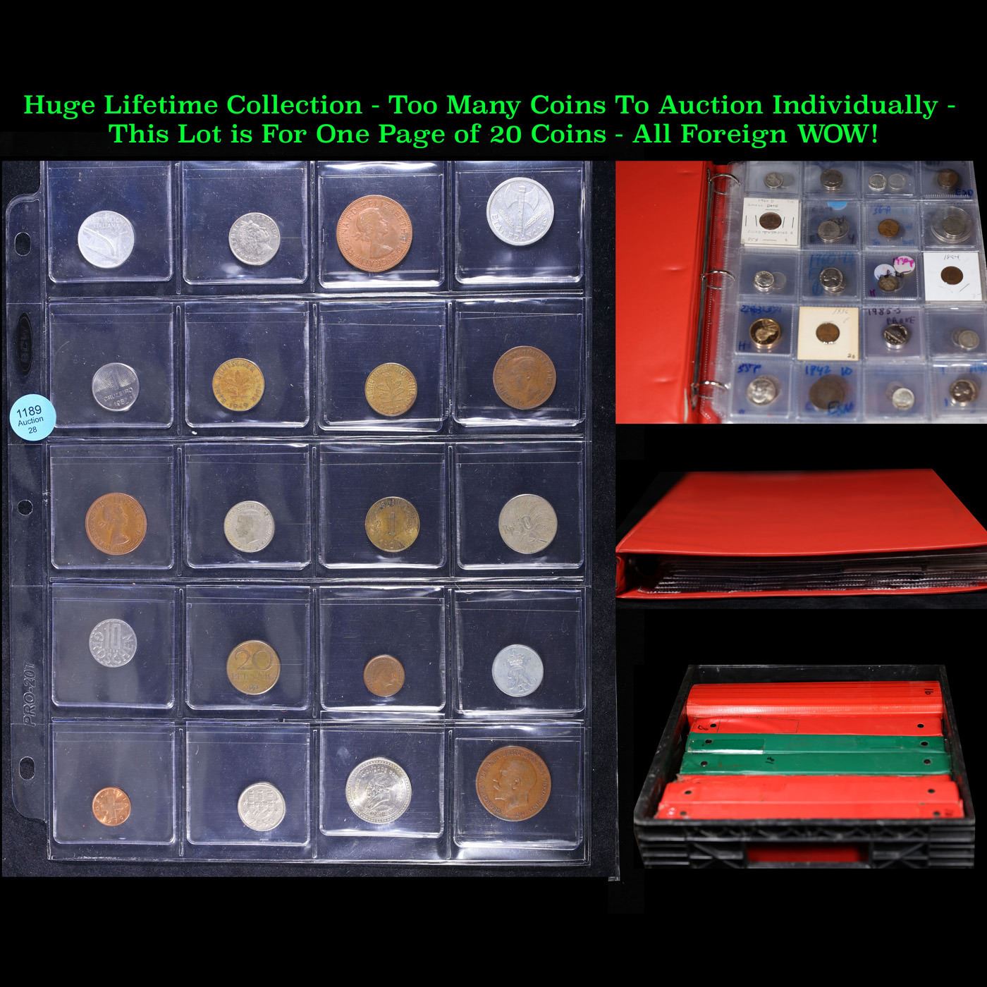 Huge Liifetime Collection - Too Many Coins To Auction Individually - This Lot is For One Page of 20 Foreign Coins. We have received a huge collection of over 10 thousand US coins in flips, 2x2 holders, and 20 coin pages. We are forced, due to limited lots, to sell this collection in pages of 20 coins. All of the pages include Silver Coins. Most contain Indian Cents, Proof Coins, Barber Coinage, Bust Coinage, Lincoln Cents, Flying Eagles, Jefferson Nickels, Roosevelt Dimes, Buffalo Nickels, Eisenhower Dollars, Kennedy Halves, Large Cents including some Draped Bust Large Cents, Mercury Dimes, and Liberty V Nickels. These pages could not be reviewed by anyone in our office due to time constraints. We estimate the value of each page to meet or exceed $200 in value! Good luck and happy hunting.