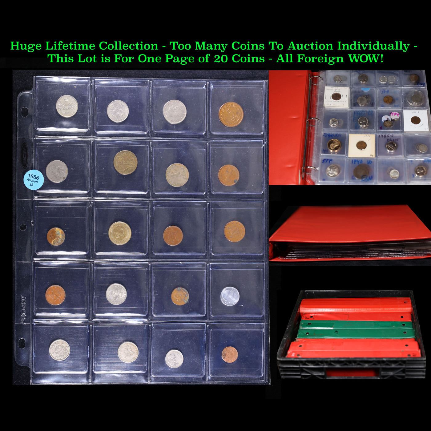 Huge Liifetime Collection - Too Many Coins To Auction Individually - This Lot is For One Page of 20 Foreign Coins. We have received a huge collection of over 10 thousand US coins in flips, 2x2 holders, and 20 coin pages. We are forced, due to limited lots, to sell this collection in pages of 20 coins. All of the pages include Silver Coins. Most contain Indian Cents, Proof Coins, Barber Coinage, Bust Coinage, Lincoln Cents, Flying Eagles, Jefferson Nickels, Roosevelt Dimes, Buffalo Nickels, Eisenhower Dollars, Kennedy Halves, Large Cents including some Draped Bust Large Cents, Mercury Dimes, and Liberty V Nickels. These pages could not be reviewed by anyone in our office due to time constraints. We estimate the value of each page to meet or exceed $200 in value! Good luck and happy hunting.
