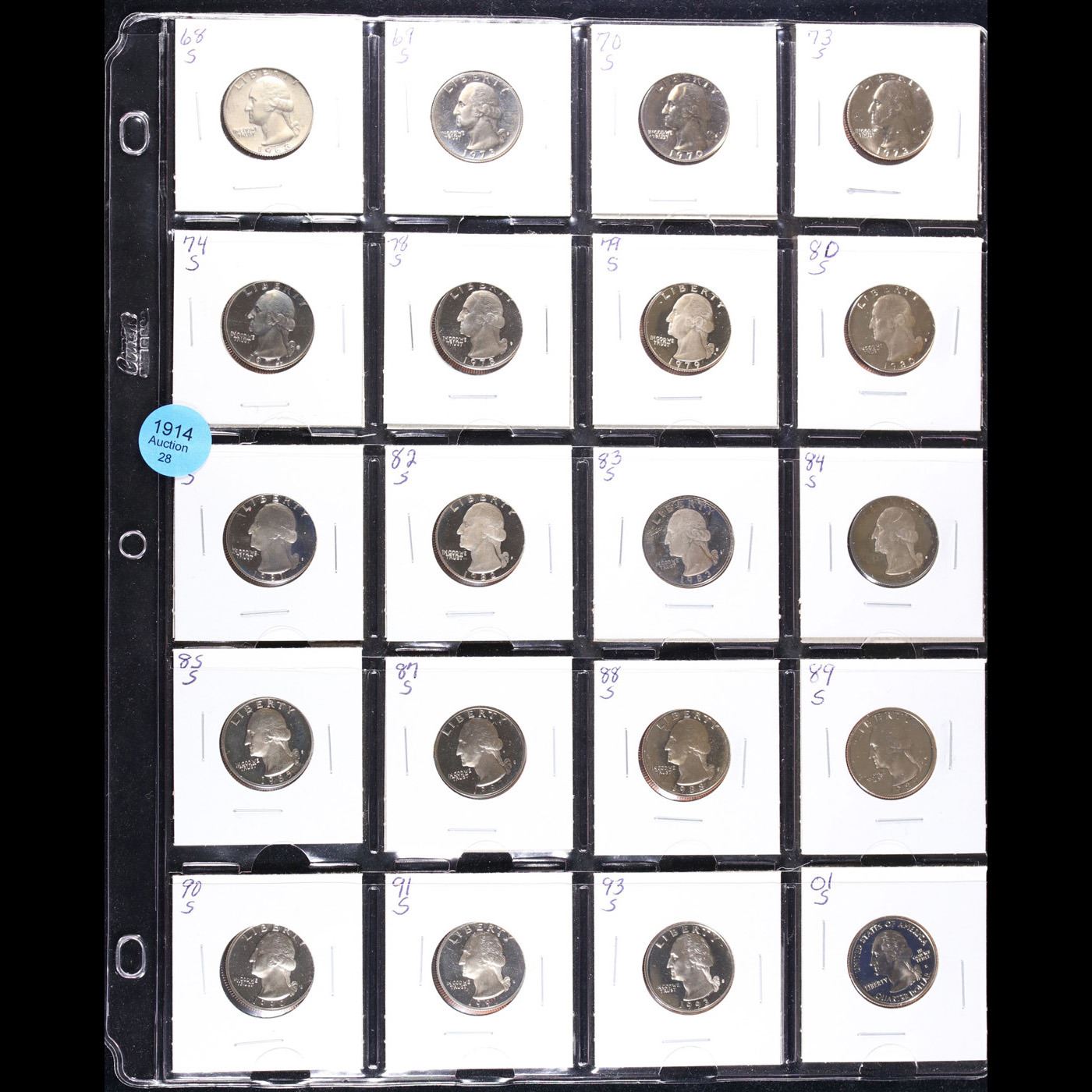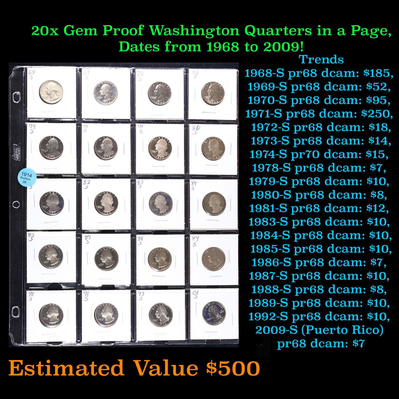 Huge Liifetime Collection - Too Many Coins To Auction Individually - This Lot is For One Page of 20 Proof Washington Quarters Dates Range From 1982-2006. We have received a huge collection of over 10 thousand US coins in flips, 2x2 holders, and 20 coin pages. We are forced, due to limited lots, to sell this collection in pages of 20 coins. This Page is For 20 Proof Washington Quarters Trends 2002-s pr69 DCAM $19 1994-s pr69 DCAM $16, 1982-s pr69 DCAM $15, 2002-s pr69 DCAM $19, 2006-s pr69 DCAM $19, 2003-s pr69 DCAM $19, 2003-s pr69 DCAM $19, 2002-s pr69 DCAM $19, 1993-s pr69 DCAM $16, 1982-s pr69 DCAM $15, 1991-s pr69 DCAM $16, 1982-s pr69 DCAM $15, 1990-s pr69 DCAM $16, 1983-s pr69 DCAM $16, 1985-s pr69 DCAM $16, 1987-s pr69 DCAM $16, 1996-s pr69 DCAM $16, 1993-s pr69 DCAM $16, 1983-s pr69 DCAM $16, 1984-s pr69 DCAM $16. We estimate the value of each page to meet or exceed $200 in value! Good luck and happy hunting.