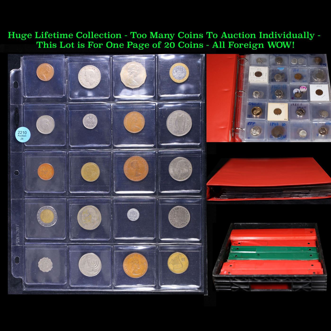 Huge Liifetime Collection - Too Many Coins To Auction Individually - This Lot is For One Page of 20 Foreign Coins. We have received a huge collection of over 10 thousand US coins in flips, 2x2 holders, and 20 coin pages. We are forced, due to limited lots, to sell this collection in pages of 20 coins. All of the pages include Silver Coins. Most contain Indian Cents, Proof Coins, Barber Coinage, Bust Coinage, Lincoln Cents, Flying Eagles, Jefferson Nickels, Roosevelt Dimes, Buffalo Nickels, Eisenhower Dollars, Kennedy Halves, Large Cents including some Draped Bust Large Cents, Mercury Dimes, and Liberty V Nickels. These pages could not be reviewed by anyone in our office due to time constraints. We estimate the value of each page to meet or exceed $200 in value! Good luck and happy hunting.