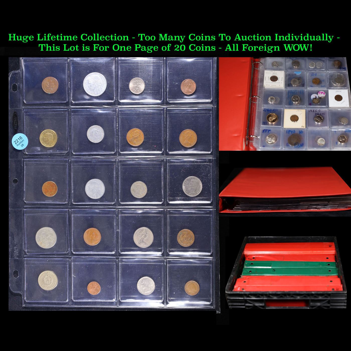 Huge Liifetime Collection - Too Many Coins To Auction Individually - This Lot is For One Page of 20 Foreign Coins. We have received a huge collection of over 10 thousand US coins in flips, 2x2 holders, and 20 coin pages. We are forced, due to limited lots, to sell this collection in pages of 20 coins. All of the pages include Silver Coins. Most contain Indian Cents, Proof Coins, Barber Coinage, Bust Coinage, Lincoln Cents, Flying Eagles, Jefferson Nickels, Roosevelt Dimes, Buffalo Nickels, Eisenhower Dollars, Kennedy Halves, Large Cents including some Draped Bust Large Cents, Mercury Dimes, and Liberty V Nickels. These pages could not be reviewed by anyone in our office due to time constraints. We estimate the value of each page to meet or exceed $200 in value! Good luck and happy hunting.