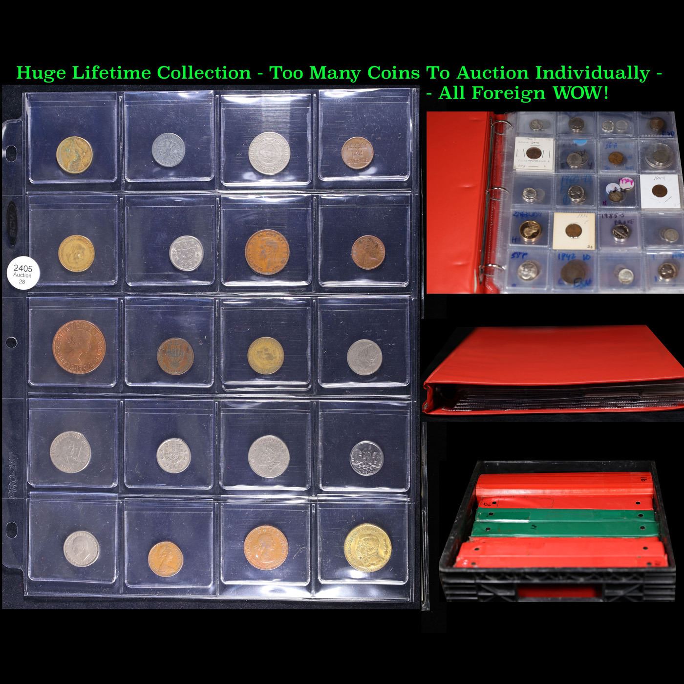 Huge Liifetime Collection - Too Many Coins To Auction Individually - This Lot is For One Page of 20 Foreign Coins. We have received a huge collection of over 10 thousand US coins in flips, 2x2 holders, and 20 coin pages. We are forced, due to limited lots, to sell this collection in pages of 20 coins. All of the pages include Silver Coins. Most contain Indian Cents, Proof Coins, Barber Coinage, Bust Coinage, Lincoln Cents, Flying Eagles, Jefferson Nickels, Roosevelt Dimes, Buffalo Nickels, Eisenhower Dollars, Kennedy Halves, Large Cents including some Draped Bust Large Cents, Mercury Dimes, and Liberty V Nickels. These pages could not be reviewed by anyone in our office due to time constraints. We estimate the value of each page to meet or exceed $200 in value! Good luck and happy hunting.