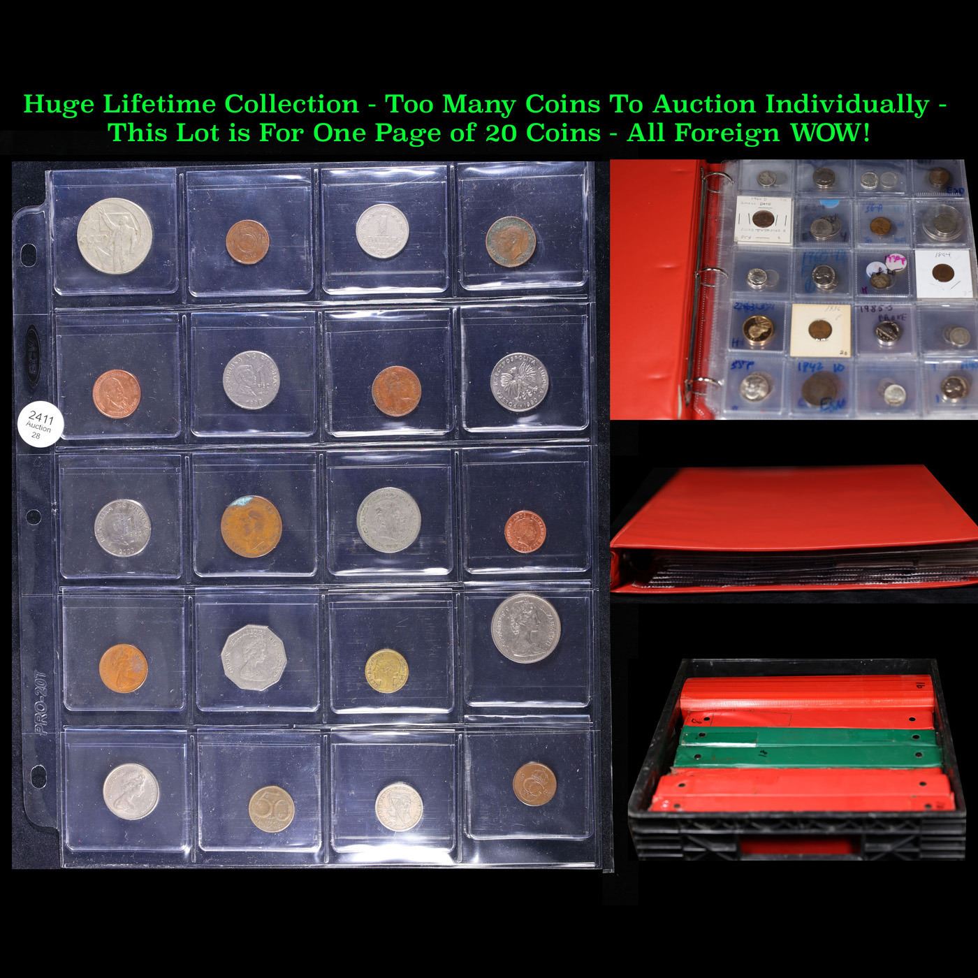 Huge Liifetime Collection - Too Many Coins To Auction Individually - This Lot is For One Page of 20 Foreign Coins. We have received a huge collection of over 10 thousand US coins in flips, 2x2 holders, and 20 coin pages. We are forced, due to limited lots, to sell this collection in pages of 20 coins. All of the pages include Silver Coins. Most contain Indian Cents, Proof Coins, Barber Coinage, Bust Coinage, Lincoln Cents, Flying Eagles, Jefferson Nickels, Roosevelt Dimes, Buffalo Nickels, Eisenhower Dollars, Kennedy Halves, Large Cents including some Draped Bust Large Cents, Mercury Dimes, and Liberty V Nickels. These pages could not be reviewed by anyone in our office due to time constraints. We estimate the value of each page to meet or exceed $200 in value! Good luck and happy hunting.