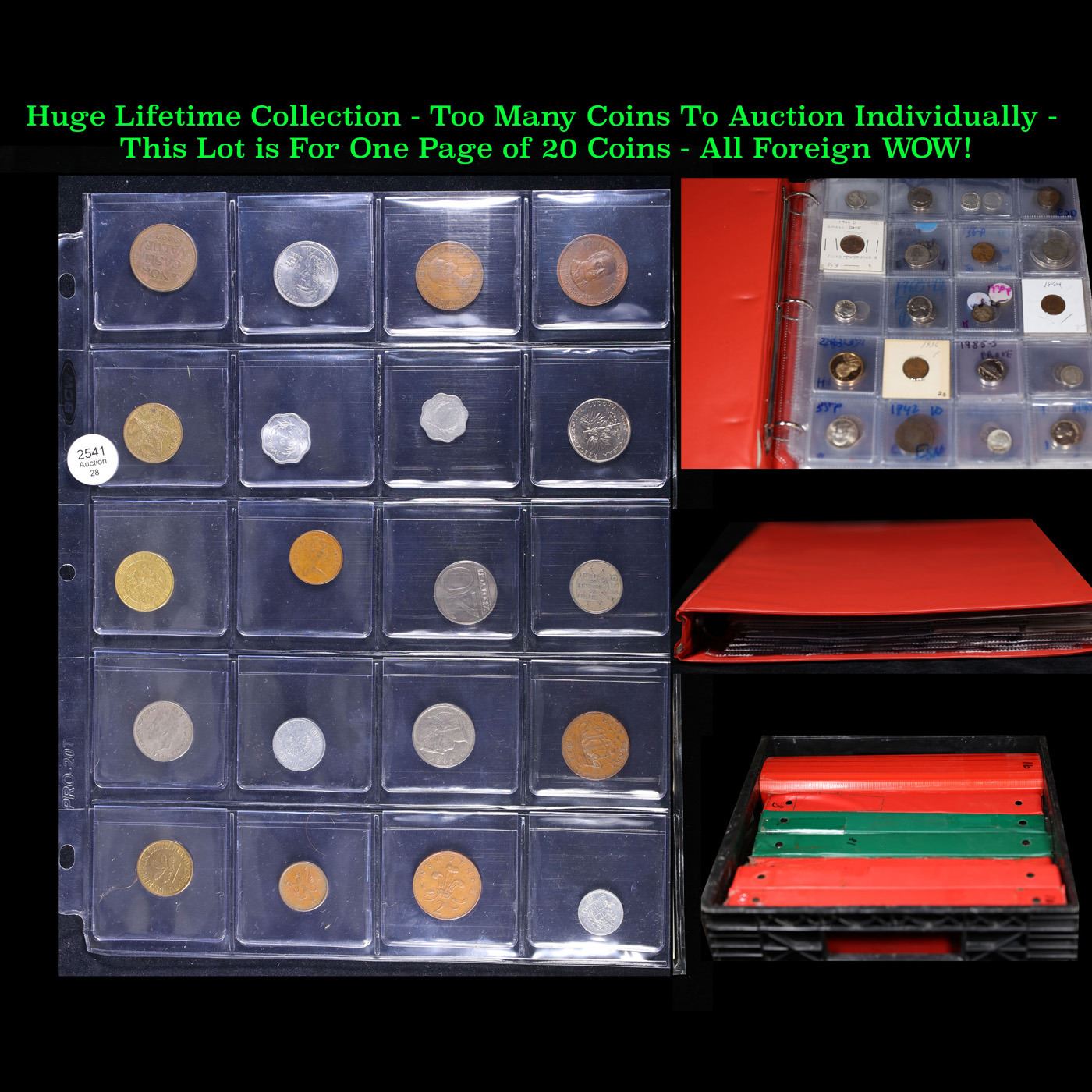 Huge Liifetime Collection - Too Many Coins To Auction Individually - This Lot is For One Page of 20 Foreign Coins. We have received a huge collection of over 10 thousand US coins in flips, 2x2 holders, and 20 coin pages. We are forced, due to limited lots, to sell this collection in pages of 20 coins. All of the pages include Silver Coins. Most contain Indian Cents, Proof Coins, Barber Coinage, Bust Coinage, Lincoln Cents, Flying Eagles, Jefferson Nickels, Roosevelt Dimes, Buffalo Nickels, Eisenhower Dollars, Kennedy Halves, Large Cents including some Draped Bust Large Cents, Mercury Dimes, and Liberty V Nickels. These pages could not be reviewed by anyone in our office due to time constraints. We estimate the value of each page to meet or exceed $200 in value! Good luck and happy hunting.