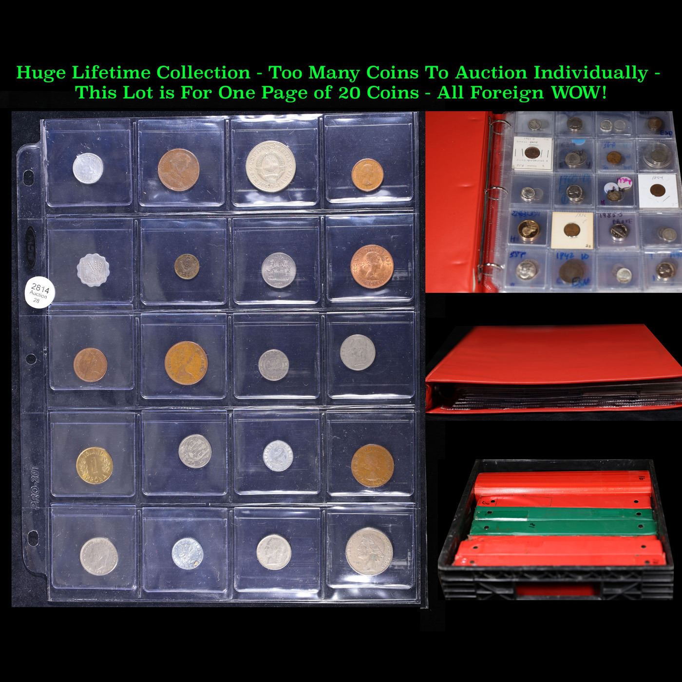 Huge Liifetime Collection - Too Many Coins To Auction Individually - This Lot is For One Page of 20 Foreign Coins. We have received a huge collection of over 10 thousand US coins in flips, 2x2 holders, and 20 coin pages. We are forced, due to limited lots, to sell this collection in pages of 20 coins. All of the pages include Silver Coins. Most contain Indian Cents, Proof Coins, Barber Coinage, Bust Coinage, Lincoln Cents, Flying Eagles, Jefferson Nickels, Roosevelt Dimes, Buffalo Nickels, Eisenhower Dollars, Kennedy Halves, Large Cents including some Draped Bust Large Cents, Mercury Dimes, and Liberty V Nickels. These pages could not be reviewed by anyone in our office due to time constraints. We estimate the value of each page to meet or exceed $200 in value! Good luck and happy hunting.