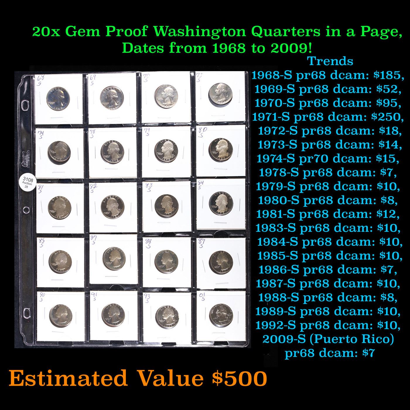 Huge Liifetime Collection - Too Many Coins To Auction Individually - This Lot is For One Page of 20 Proof Washington Quarters Dates Range From 1982-2006. We have received a huge collection of over 10 thousand US coins in flips, 2x2 holders, and 20 coin pages. We are forced, due to limited lots, to sell this collection in pages of 20 coins. This Page is For 20 Proof Washington Quarters Trends 2002-s pr69 DCAM $19 1994-s pr69 DCAM $16, 1982-s pr69 DCAM $15, 2002-s pr69 DCAM $19, 2006-s pr69 DCAM $19, 2003-s pr69 DCAM $19, 2003-s pr69 DCAM $19, 2002-s pr69 DCAM $19, 1993-s pr69 DCAM $16, 1982-s pr69 DCAM $15, 1991-s pr69 DCAM $16, 1982-s pr69 DCAM $15, 1990-s pr69 DCAM $16, 1983-s pr69 DCAM $16, 1985-s pr69 DCAM $16, 1987-s pr69 DCAM $16, 1996-s pr69 DCAM $16, 1993-s pr69 DCAM $16, 1983-s pr69 DCAM $16, 1984-s pr69 DCAM $16. We estimate the value of each page to meet or exceed $200 in value! Good luck and happy hunting.