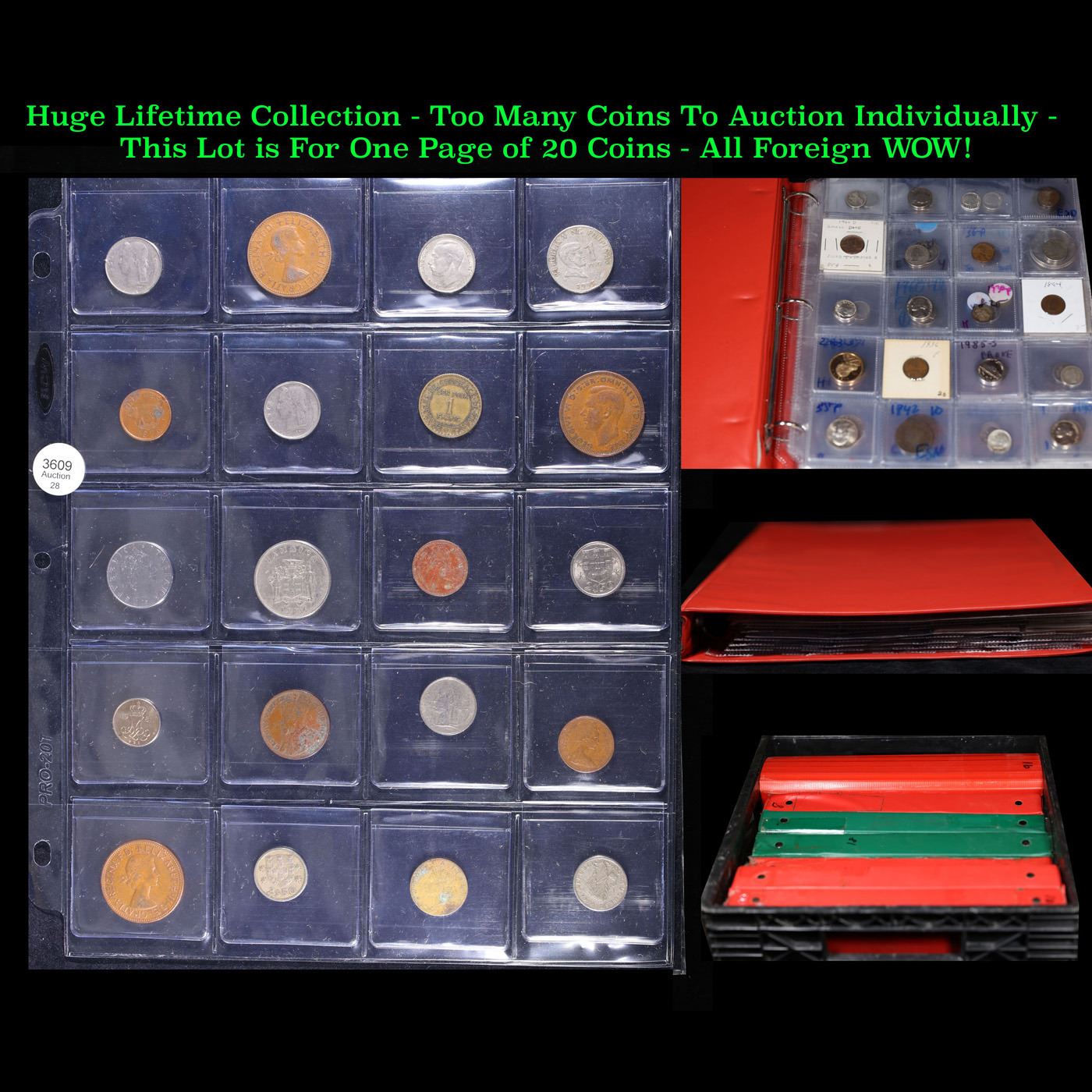 Huge Liifetime Collection - Too Many Coins To Auction Individually - This Lot is For One Page of 20 Foreign Coins. We have received a huge collection of over 10 thousand US coins in flips, 2x2 holders, and 20 coin pages. We are forced, due to limited lots, to sell this collection in pages of 20 coins. All of the pages include Silver Coins. Most contain Indian Cents, Proof Coins, Barber Coinage, Bust Coinage, Lincoln Cents, Flying Eagles, Jefferson Nickels, Roosevelt Dimes, Buffalo Nickels, Eisenhower Dollars, Kennedy Halves, Large Cents including some Draped Bust Large Cents, Mercury Dimes, and Liberty V Nickels. These pages could not be reviewed by anyone in our office due to time constraints. We estimate the value of each page to meet or exceed $200 in value! Good luck and happy hunting.