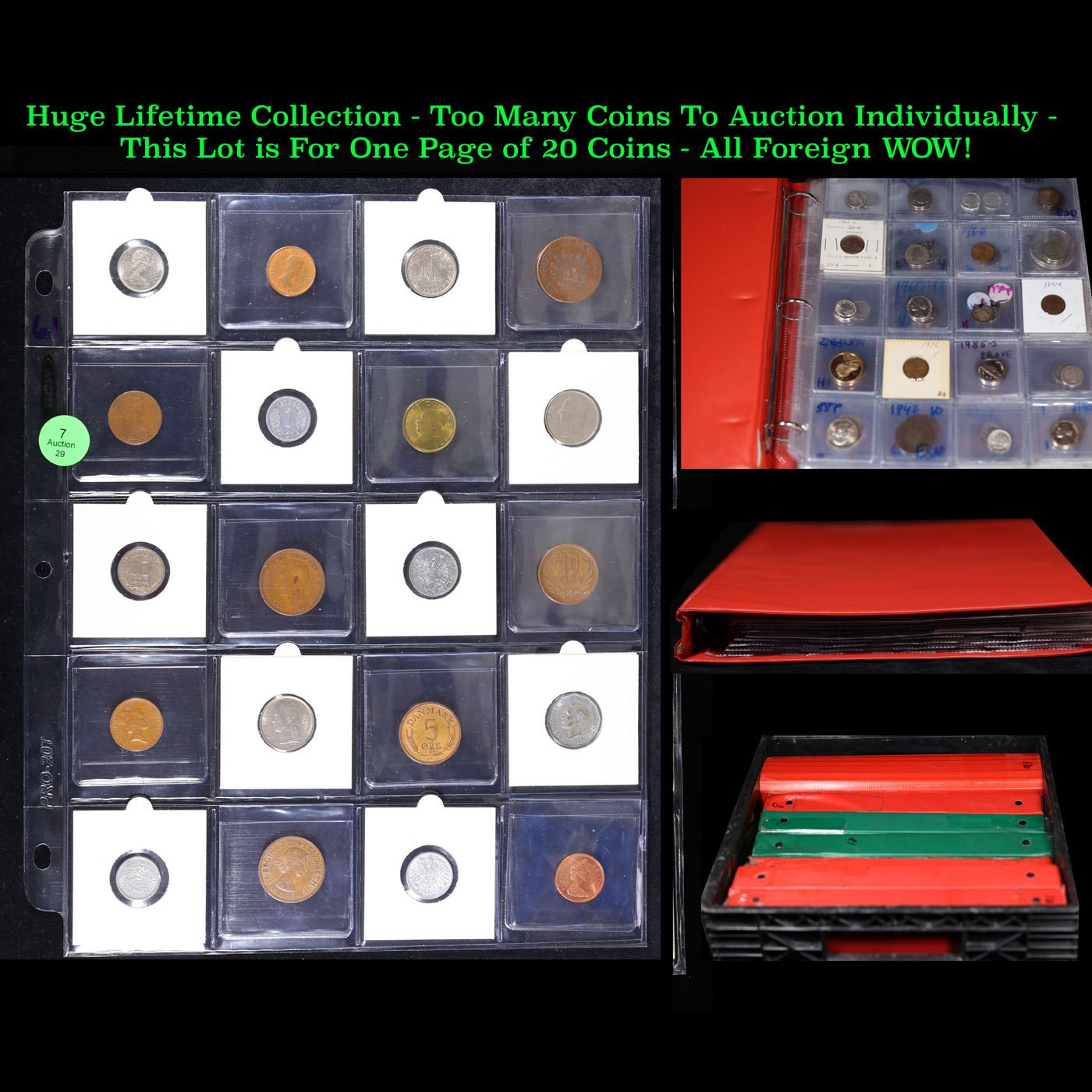 Huge Liifetime Collection - Too Many Coins To Auction Individually - This Lot is For One Page of 20 Foreign Coins. We have received a huge collection of over 10 thousand US coins in flips, 2x2 holders, and 20 coin pages. We are forced, due to limited lots, to sell this collection in pages of 20 coins. All of the pages include Silver Coins. Most contain Indian Cents, Proof Coins, Barber Coinage, Bust Coinage, Lincoln Cents, Flying Eagles, Jefferson Nickels, Roosevelt Dimes, Buffalo Nickels, Eisenhower Dollars, Kennedy Halves, Large Cents including some Draped Bust Large Cents, Mercury Dimes, and Liberty V Nickels. These pages could not be reviewed by anyone in our office due to time constraints. We estimate the value of each page to meet or exceed $200 in value! Good luck and happy hunting.