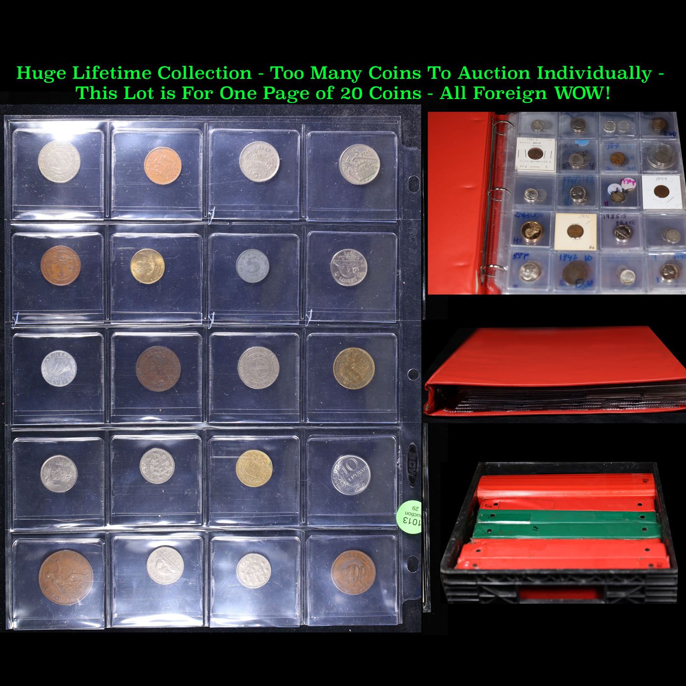 Huge Liifetime Collection - Too Many Coins To Auction Individually - This Lot is For One Page of 20 Foreign Coins. We have received a huge collection of over 10 thousand US coins in flips, 2x2 holders, and 20 coin pages. We are forced, due to limited lots, to sell this collection in pages of 20 coins. All of the pages include Silver Coins. Most contain Indian Cents, Proof Coins, Barber Coinage, Bust Coinage, Lincoln Cents, Flying Eagles, Jefferson Nickels, Roosevelt Dimes, Buffalo Nickels, Eisenhower Dollars, Kennedy Halves, Large Cents including some Draped Bust Large Cents, Mercury Dimes, and Liberty V Nickels. These pages could not be reviewed by anyone in our office due to time constraints. We estimate the value of each page to meet or exceed $200 in value! Good luck and happy hunting.