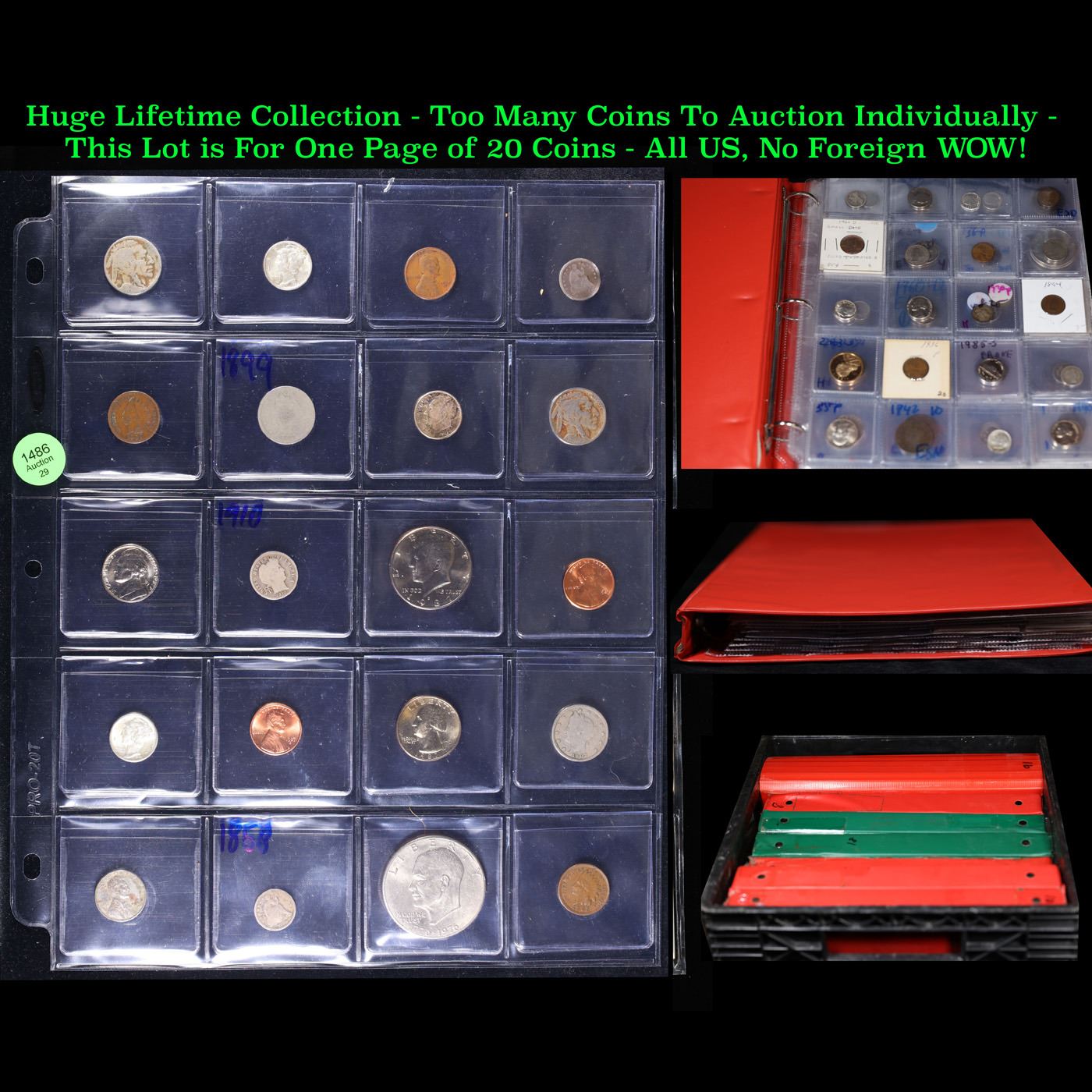 Huge Liifetime Collection - Too Many Coins To Auction Individually - This Lot is For One Page of 20 Coins - All US, No Foreign WOW!. We have received a huge collection of over 10 thousand US coins in flips, 2x2 holders, and 20 coin pages. We are forced, due to limited lots, to sell this collection in pages of 20 coins. All of the pages include Silver Coins. Most contain Indian Cents, Proof Coins, Barber Coinage, Bust Coinage, Lincoln Cents, Flying Eagles, Jefferson Nickels, Roosevelt Dimes, Buffalo Nickels, Eisenhower Dollars, Kennedy Halves, Large Cents including some Draped Bust Large Cents, Mercury Dimes, and Liberty V Nickels. These pages could not be reviewed by anyone in our office due to time constraints. We estimate the value of each page to meet or exceed $200 in value! Good luck and happy hunting.