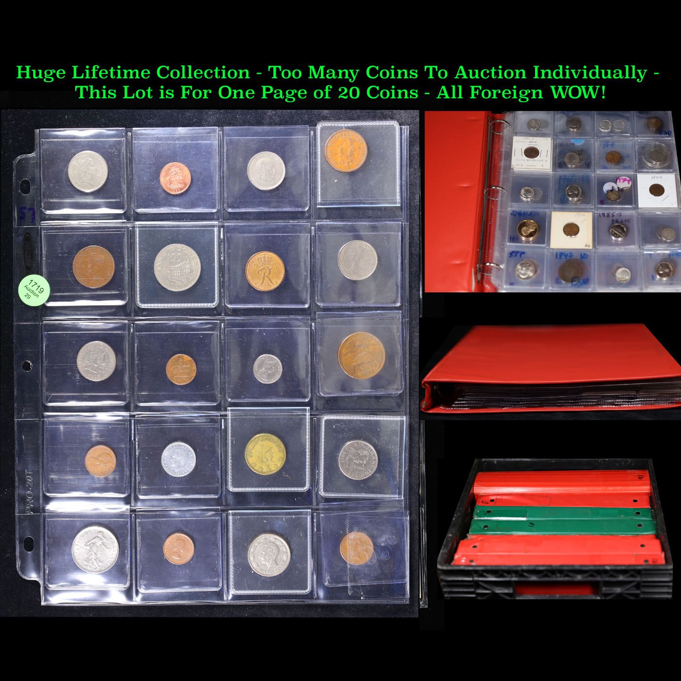 Huge Liifetime Collection - Too Many Coins To Auction Individually - This Lot is For One Page of 20 Foreign Coins. We have received a huge collection of over 10 thousand US coins in flips, 2x2 holders, and 20 coin pages. We are forced, due to limited lots, to sell this collection in pages of 20 coins. All of the pages include Silver Coins. Most contain Indian Cents, Proof Coins, Barber Coinage, Bust Coinage, Lincoln Cents, Flying Eagles, Jefferson Nickels, Roosevelt Dimes, Buffalo Nickels, Eisenhower Dollars, Kennedy Halves, Large Cents including some Draped Bust Large Cents, Mercury Dimes, and Liberty V Nickels. These pages could not be reviewed by anyone in our office due to time constraints. We estimate the value of each page to meet or exceed $200 in value! Good luck and happy hunting.