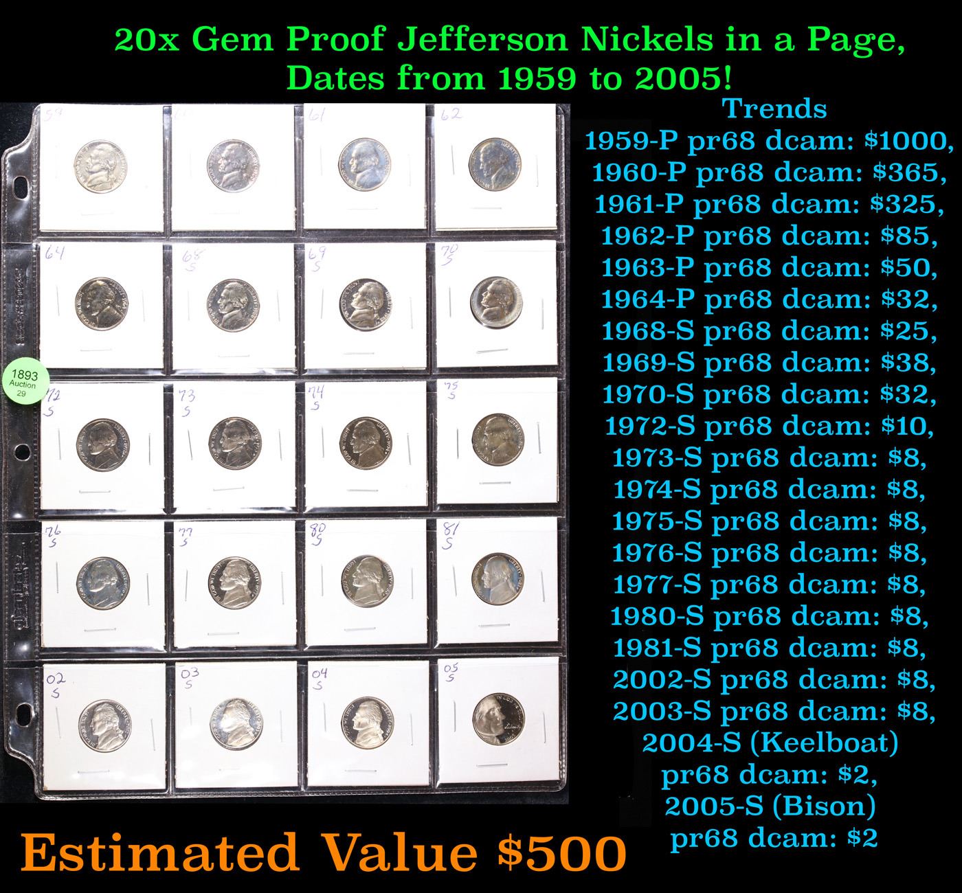 Huge Liifetime Collection - Too Many Coins To Auction Individually - This Lot is For One Page of 20 Proof Jefferson Nickels Dates Range From 1971-2006.