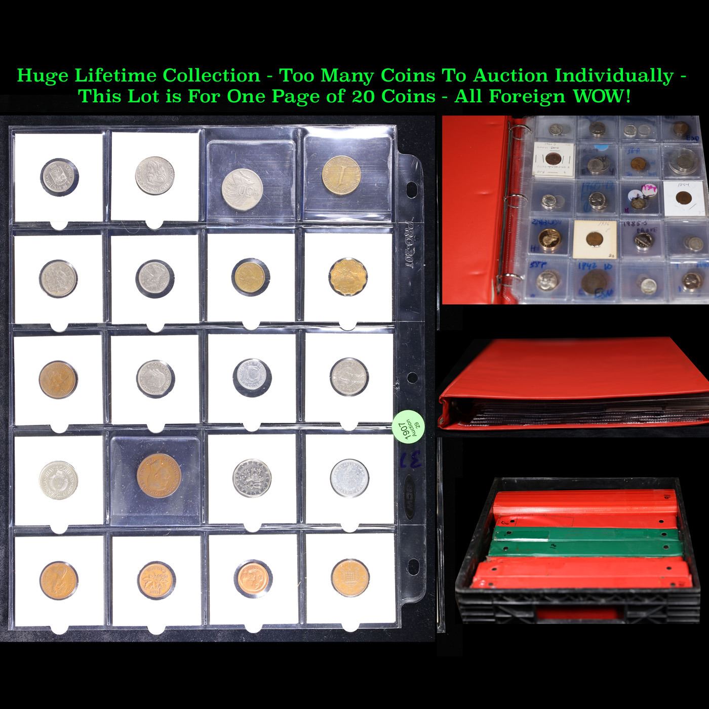 Huge Liifetime Collection - Too Many Coins To Auction Individually - This Lot is For One Page of 20 Foreign Coins. We have received a huge collection of over 10 thousand US coins in flips, 2x2 holders, and 20 coin pages. We are forced, due to limited lots, to sell this collection in pages of 20 coins. All of the pages include Silver Coins. Most contain Indian Cents, Proof Coins, Barber Coinage, Bust Coinage, Lincoln Cents, Flying Eagles, Jefferson Nickels, Roosevelt Dimes, Buffalo Nickels, Eisenhower Dollars, Kennedy Halves, Large Cents including some Draped Bust Large Cents, Mercury Dimes, and Liberty V Nickels. These pages could not be reviewed by anyone in our office due to time constraints. We estimate the value of each page to meet or exceed $200 in value! Good luck and happy hunting.