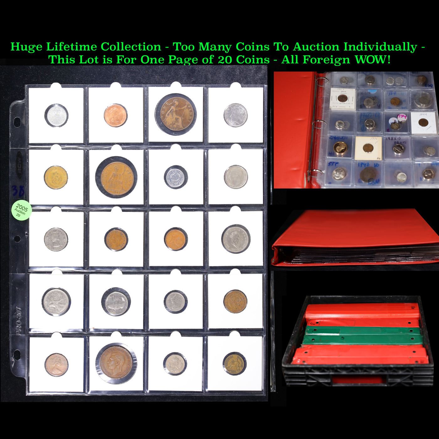 Huge Liifetime Collection - Too Many Coins To Auction Individually - This Lot is For One Page of 20 Foreign Coins. We have received a huge collection of over 10 thousand US coins in flips, 2x2 holders, and 20 coin pages. We are forced, due to limited lots, to sell this collection in pages of 20 coins. All of the pages include Silver Coins. Most contain Indian Cents, Proof Coins, Barber Coinage, Bust Coinage, Lincoln Cents, Flying Eagles, Jefferson Nickels, Roosevelt Dimes, Buffalo Nickels, Eisenhower Dollars, Kennedy Halves, Large Cents including some Draped Bust Large Cents, Mercury Dimes, and Liberty V Nickels. These pages could not be reviewed by anyone in our office due to time constraints. We estimate the value of each page to meet or exceed $200 in value! Good luck and happy hunting.