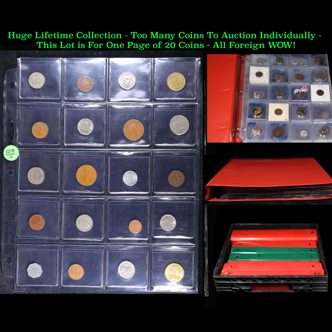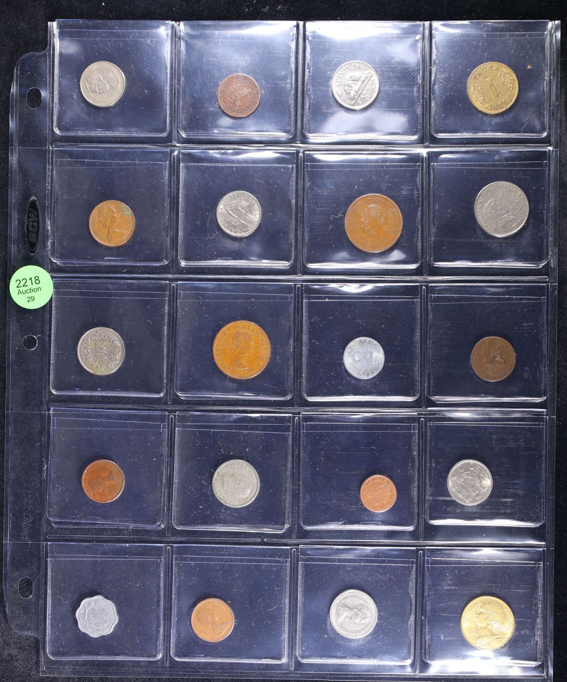 Huge Liifetime Collection - Too Many Coins To Auction Individually - This Lot is For One Page of 20 Foreign Coins. We have received a huge collection of over 10 thousand US coins in flips, 2x2 holders, and 20 coin pages. We are forced, due to limited lots, to sell this collection in pages of 20 coins. All of the pages include Silver Coins. Most contain Indian Cents, Proof Coins, Barber Coinage, Bust Coinage, Lincoln Cents, Flying Eagles, Jefferson Nickels, Roosevelt Dimes, Buffalo Nickels, Eisenhower Dollars, Kennedy Halves, Large Cents including some Draped Bust Large Cents, Mercury Dimes, and Liberty V Nickels. These pages could not be reviewed by anyone in our office due to time constraints. We estimate the value of each page to meet or exceed $200 in value! Good luck and happy hunting.