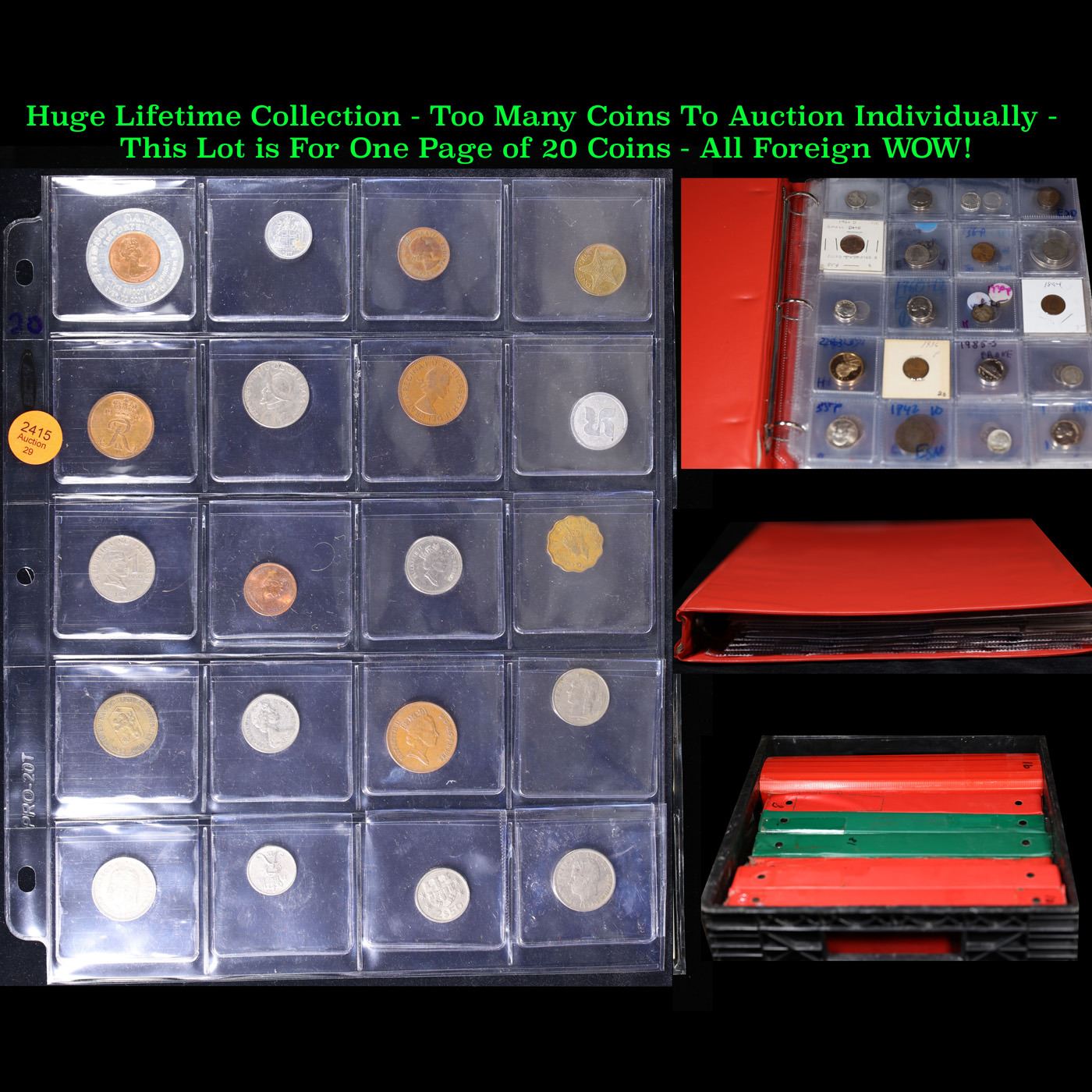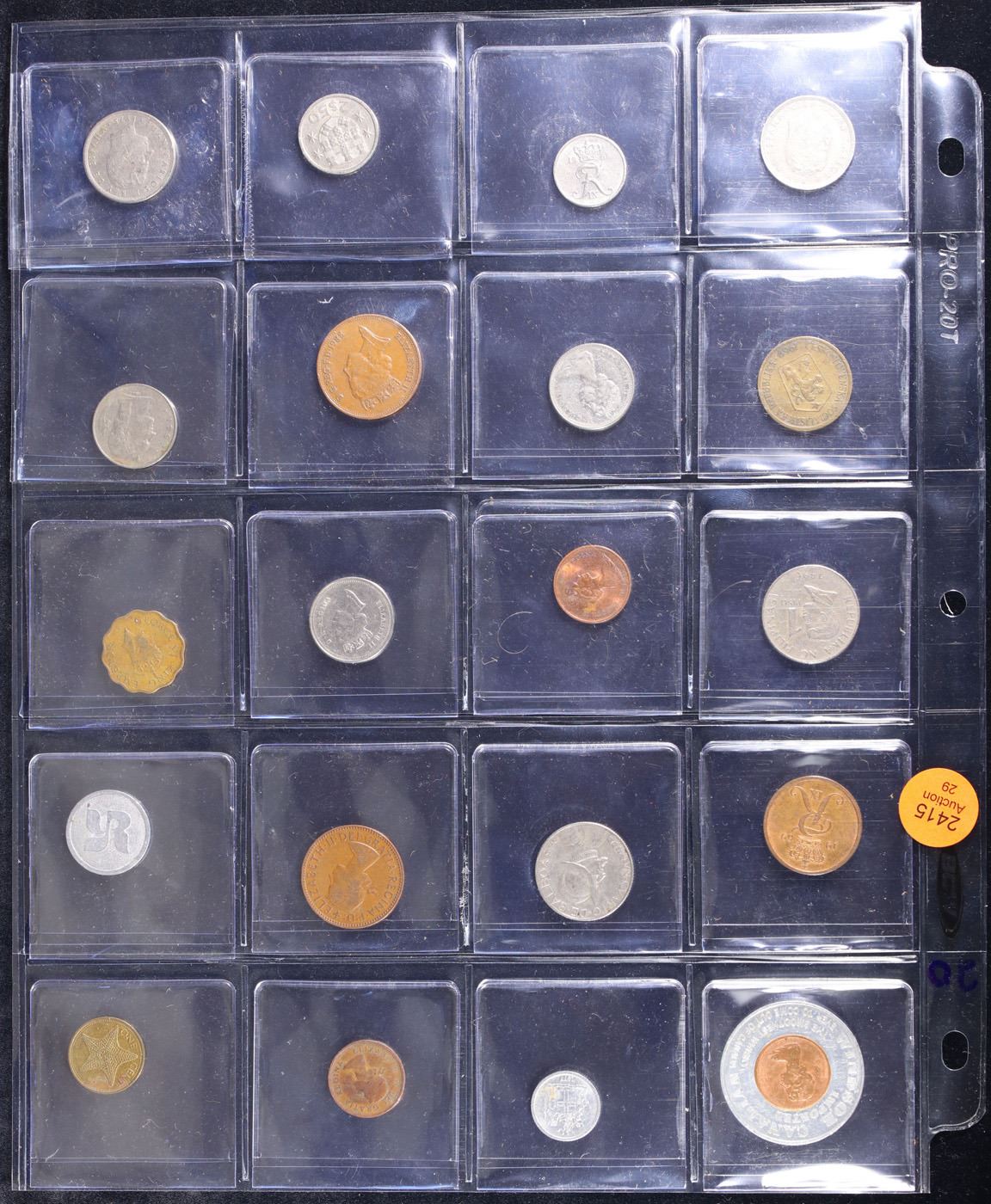 Huge Liifetime Collection - Too Many Coins To Auction Individually - This Lot is For One Page of 20 Foreign Coins. We have received a huge collection of over 10 thousand US coins in flips, 2x2 holders, and 20 coin pages. We are forced, due to limited lots, to sell this collection in pages of 20 coins. All of the pages include Silver Coins. Most contain Indian Cents, Proof Coins, Barber Coinage, Bust Coinage, Lincoln Cents, Flying Eagles, Jefferson Nickels, Roosevelt Dimes, Buffalo Nickels, Eisenhower Dollars, Kennedy Halves, Large Cents including some Draped Bust Large Cents, Mercury Dimes, and Liberty V Nickels. These pages could not be reviewed by anyone in our office due to time constraints. We estimate the value of each page to meet or exceed $200 in value! Good luck and happy hunting.
