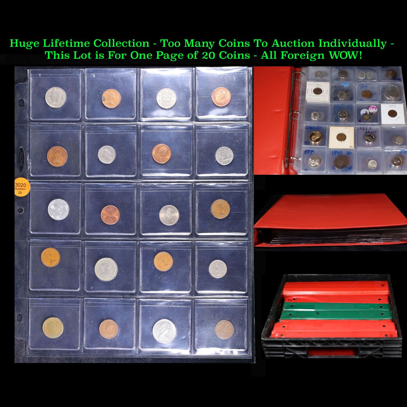 Huge Liifetime Collection - Too Many Coins To Auction Individually - This Lot is For One Page of 20 Foreign Coins. We have received a huge collection of over 10 thousand US coins in flips, 2x2 holders, and 20 coin pages. We are forced, due to limited lots, to sell this collection in pages of 20 coins. All of the pages include Silver Coins. Most contain Indian Cents, Proof Coins, Barber Coinage, Bust Coinage, Lincoln Cents, Flying Eagles, Jefferson Nickels, Roosevelt Dimes, Buffalo Nickels, Eisenhower Dollars, Kennedy Halves, Large Cents including some Draped Bust Large Cents, Mercury Dimes, and Liberty V Nickels. These pages could not be reviewed by anyone in our office due to time constraints. We estimate the value of each page to meet or exceed $200 in value! Good luck and happy hunting.
