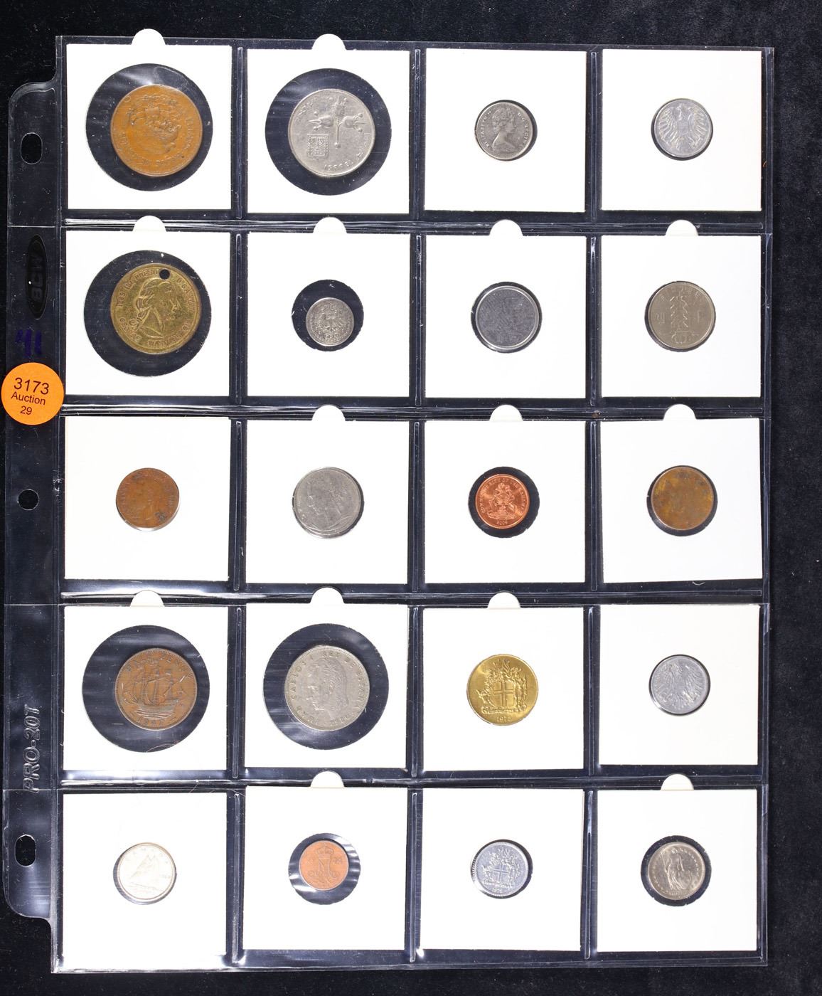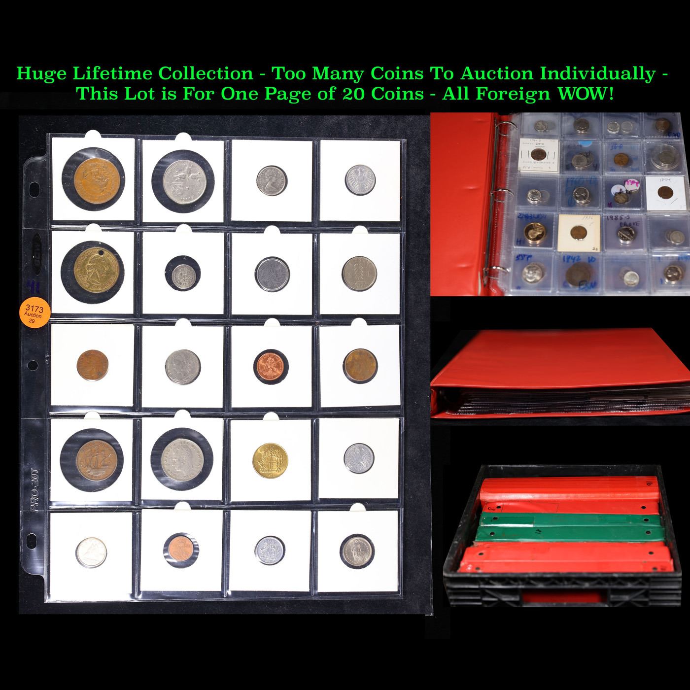Huge Liifetime Collection - Too Many Coins To Auction Individually - This Lot is For One Page of 20 Foreign Coins. We have received a huge collection of over 10 thousand US coins in flips, 2x2 holders, and 20 coin pages. We are forced, due to limited lots, to sell this collection in pages of 20 coins. All of the pages include Silver Coins. Most contain Indian Cents, Proof Coins, Barber Coinage, Bust Coinage, Lincoln Cents, Flying Eagles, Jefferson Nickels, Roosevelt Dimes, Buffalo Nickels, Eisenhower Dollars, Kennedy Halves, Large Cents including some Draped Bust Large Cents, Mercury Dimes, and Liberty V Nickels. These pages could not be reviewed by anyone in our office due to time constraints. We estimate the value of each page to meet or exceed $200 in value! Good luck and happy hunting.