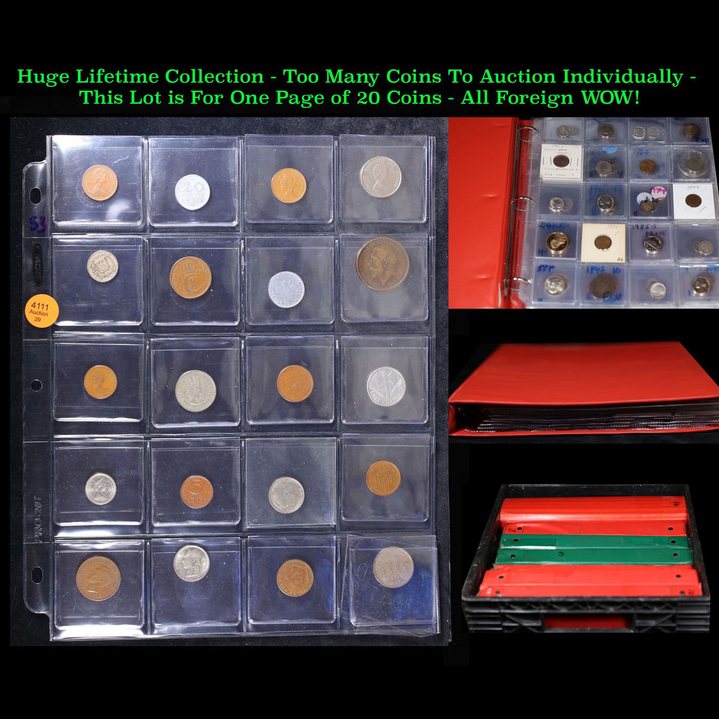 Huge Liifetime Collection - Too Many Coins To Auction Individually - This Lot is For One Page of 20 Foreign Coins. We have received a huge collection of over 10 thousand US coins in flips, 2x2 holders, and 20 coin pages. We are forced, due to limited lots, to sell this collection in pages of 20 coins. All of the pages include Silver Coins. Most contain Indian Cents, Proof Coins, Barber Coinage, Bust Coinage, Lincoln Cents, Flying Eagles, Jefferson Nickels, Roosevelt Dimes, Buffalo Nickels, Eisenhower Dollars, Kennedy Halves, Large Cents including some Draped Bust Large Cents, Mercury Dimes, and Liberty V Nickels. These pages could not be reviewed by anyone in our office due to time constraints. We estimate the value of each page to meet or exceed $200 in value! Good luck and happy hunting.