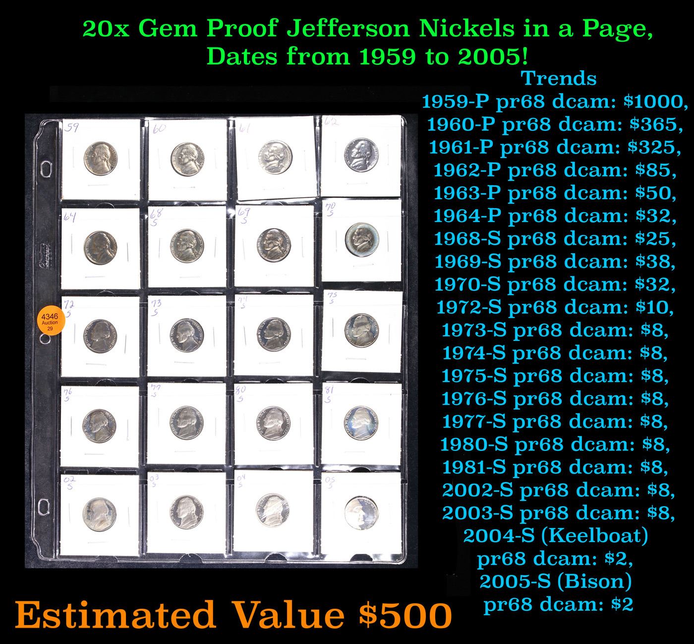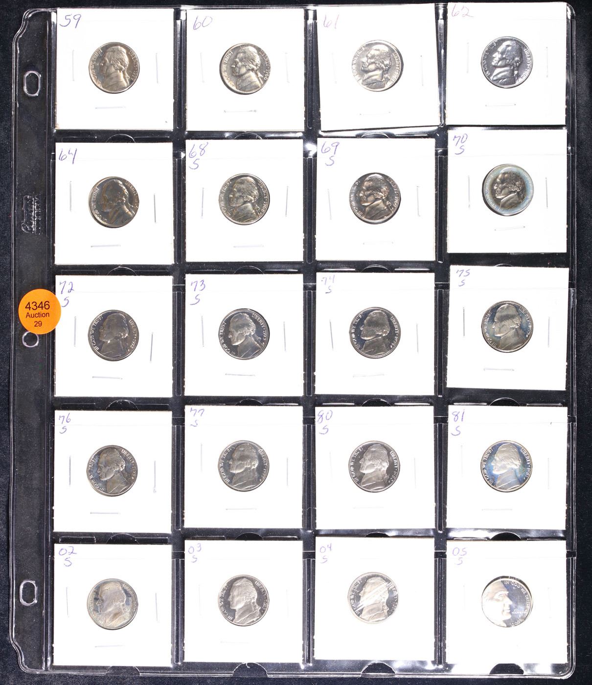 Huge Liifetime Collection - Too Many Coins To Auction Individually - This Lot is For One Page of 20 Proof Jefferson Nickels Dates Range From 1971-2006.