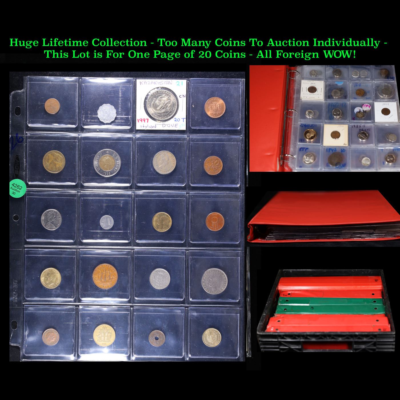 Huge Liifetime Collection - Too Many Coins To Auction Individually - This Lot is For One Page of 20 Foreign Coins. We have received a huge collection of over 10 thousand US coins in flips, 2x2 holders, and 20 coin pages. We are forced, due to limited lots, to sell this collection in pages of 20 coins. All of the pages include Silver Coins. Most contain Indian Cents, Proof Coins, Barber Coinage, Bust Coinage, Lincoln Cents, Flying Eagles, Jefferson Nickels, Roosevelt Dimes, Buffalo Nickels, Eisenhower Dollars, Kennedy Halves, Large Cents including some Draped Bust Large Cents, Mercury Dimes, and Liberty V Nickels. These pages could not be reviewed by anyone in our office due to time constraints. We estimate the value of each page to meet or exceed $200 in value! Good luck and happy hunting.