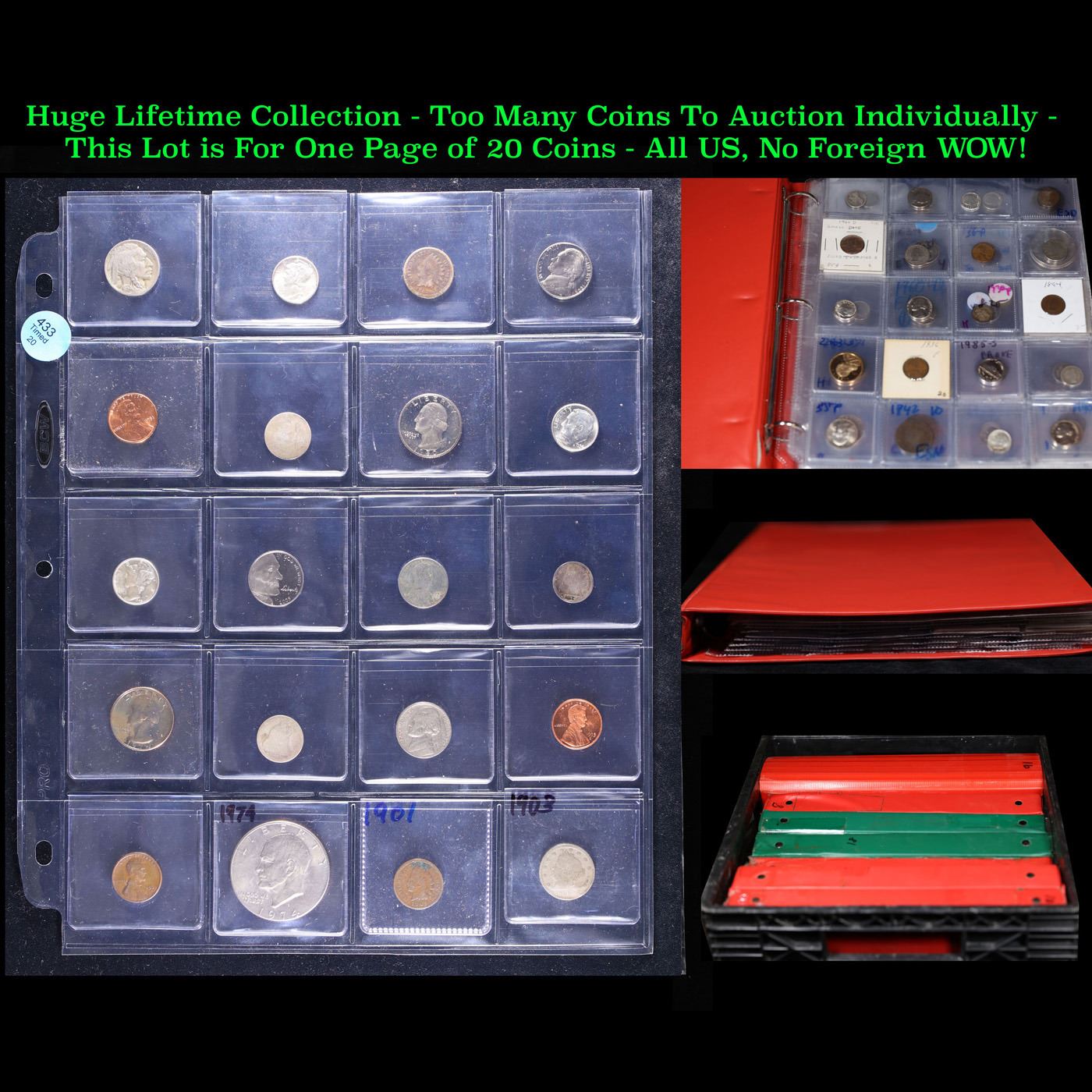 Huge Liifetime Collection - Too Many Coins To Auction Individually - This Lot is For One Page of 20 Coins - All US, No Foreign WOW!. We have received a huge collection of over 10 thousand US coins in flips, 2x2 holders, and 20 coin pages. We are forced, due to limited lots, to sell this collection in pages of 20 coins. All of the pages include Silver Coins. Most contain Indian Cents, Proof Coins, Barber Coinage, Bust Coinage, Lincoln Cents, Flying Eagles, Jefferson Nickels, Roosevelt Dimes, Buffalo Nickels, Eisenhower Dollars, Kennedy Halves, Large Cents including some Draped Bust Large Cents, Mercury Dimes, and Liberty V Nickels. These pages could not be reviewed by anyone in our office due to time constraints. We estimate the value of each page to meet or exceed $200 in value! Good luck and happy hunting.