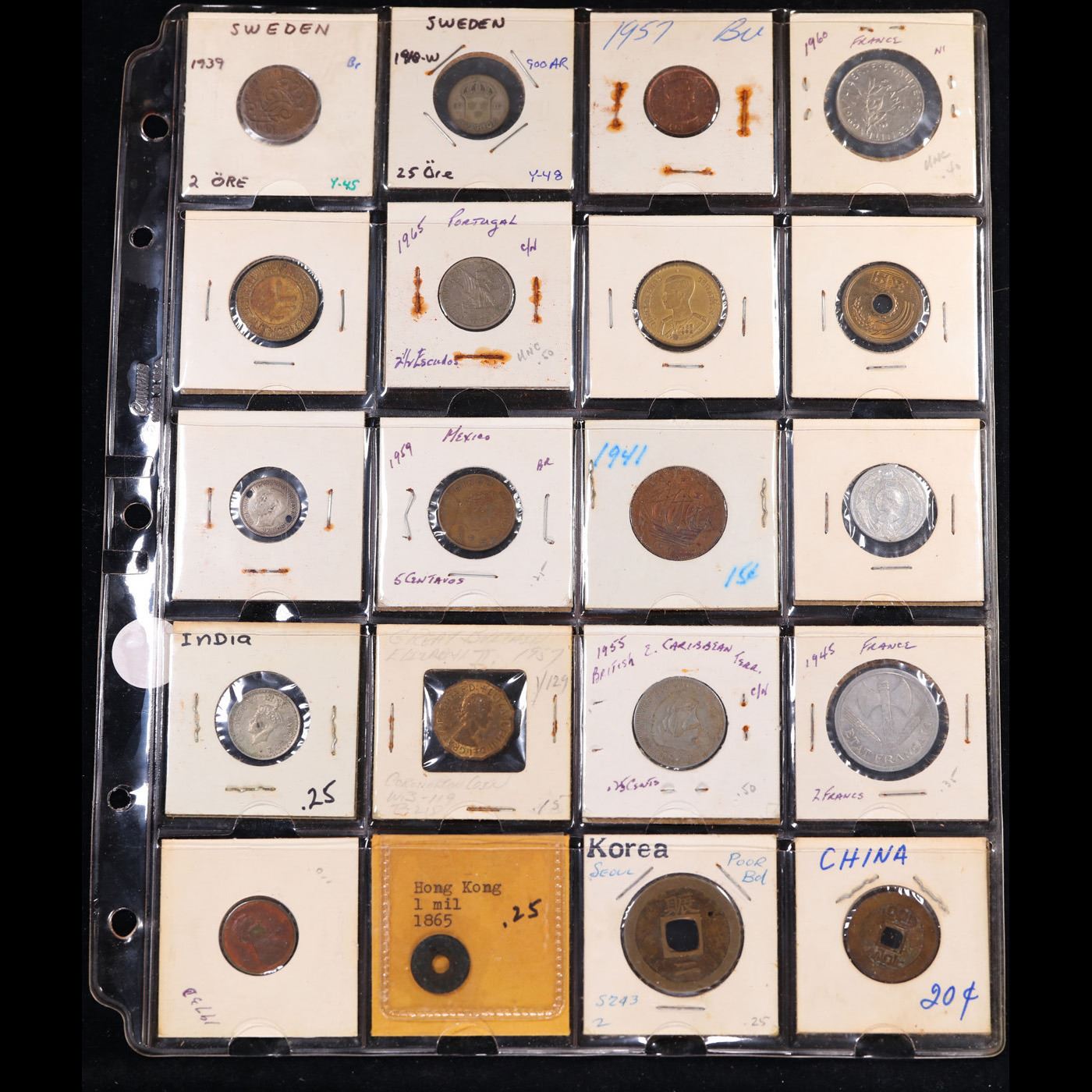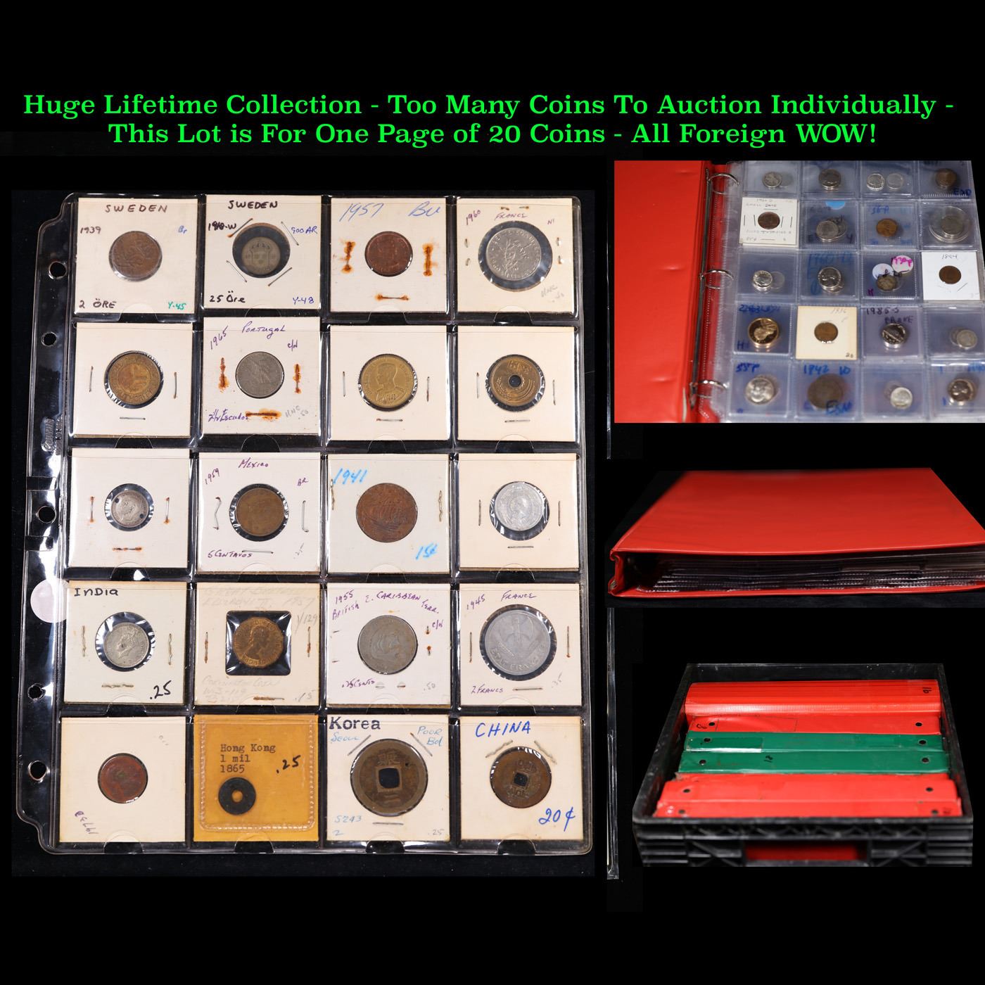 Huge Liifetime Collection - Too Many Coins To Auction Individually - This Lot is For One Page of 20 Foreign Coins. We have received a huge collection of over 10 thousand US coins in flips, 2x2 holders, and 20 coin pages. We are forced, due to limited lots, to sell this collection in pages of 20 coins. All of the pages include Silver Coins. Most contain Indian Cents, Proof Coins, Barber Coinage, Bust Coinage, Lincoln Cents, Flying Eagles, Jefferson Nickels, Roosevelt Dimes, Buffalo Nickels, Eisenhower Dollars, Kennedy Halves, Large Cents including some Draped Bust Large Cents, Mercury Dimes, and Liberty V Nickels. These pages could not be reviewed by anyone in our office due to time constraints. We estimate the value of each page to meet or exceed $200 in value! Good luck and happy hunting.