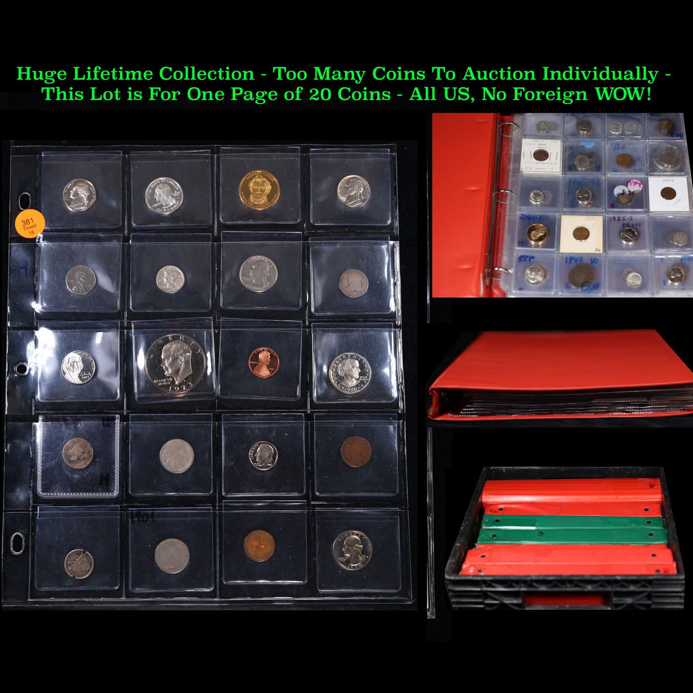 Huge Liifetime Collection - Too Many Coins To Auction Individually - This Lot is For One Page of 20 Coins - All US, No Foreign WOW! High Value. We have received a huge collection of over 10 thousand US coins in flips, 2x2 holders, and 20 coin pages. We are forced, due to limited lots, to sell this collection in pages of 20 coins. All of the pages include Silver Coins. Most contain Indian Cents, Proof Coins, Barber Coinage, Bust Coinage, Lincoln Cents, Flying Eagles, Jefferson Nickels, Roosevelt Dimes, Buffalo Nickels, Eisenhower Dollars, Kennedy Halves, Large Cents including some Draped Bust Large Cents, Mercury Dimes, and Liberty V Nickels. These pages could not be reviewed by anyone in our office due to time constraints. We estimate the value of each page to meet or exceed $200 in value! Good luck and happy hunting.
