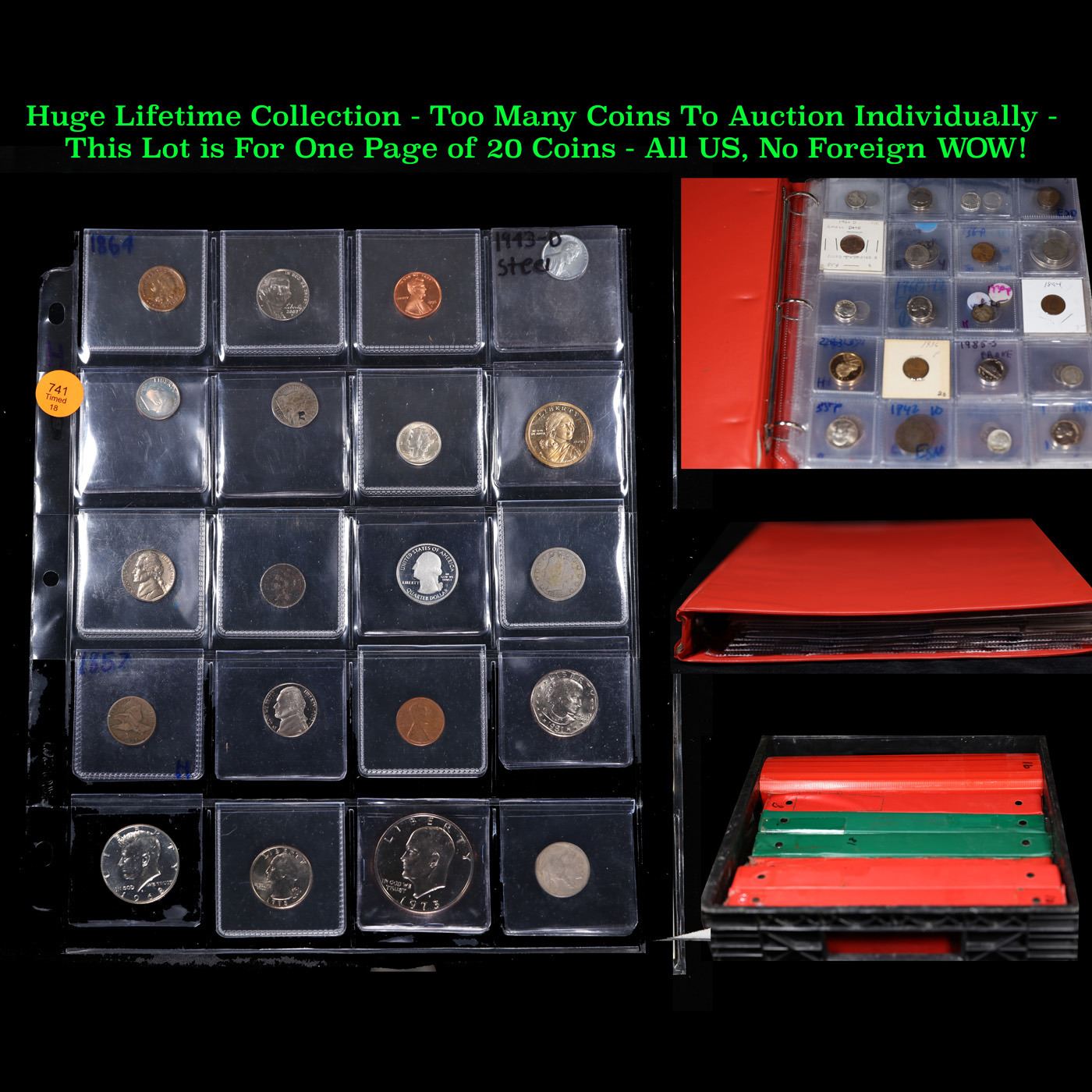 Huge Liifetime Collection - Too Many Coins To Auction Individually - This Lot is For One Page of 20 Coins - All US, No Foreign WOW! High Value. We have received a huge collection of over 10 thousand US coins in flips, 2x2 holders, and 20 coin pages. We are forced, due to limited lots, to sell this collection in pages of 20 coins. All of the pages include Silver Coins. Most contain Indian Cents, Proof Coins, Barber Coinage, Bust Coinage, Lincoln Cents, Flying Eagles, Jefferson Nickels, Roosevelt Dimes, Buffalo Nickels, Eisenhower Dollars, Kennedy Halves, Large Cents including some Draped Bust Large Cents, Mercury Dimes, and Liberty V Nickels. These pages could not be reviewed by anyone in our office due to time constraints. We estimate the value of each page to meet or exceed $200 in value! Good luck and happy hunting.