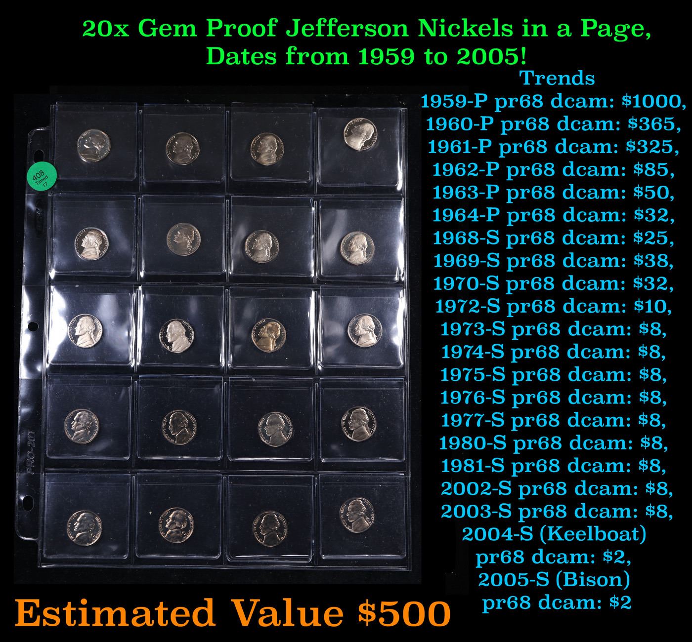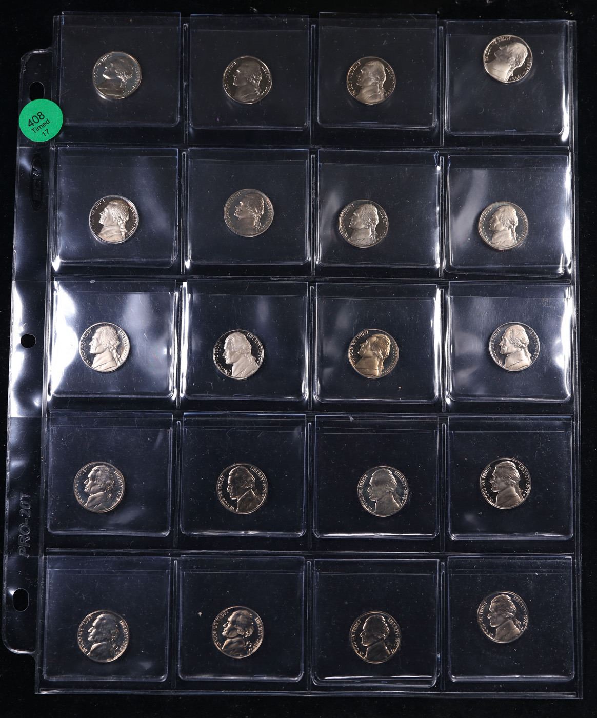 Huge Liifetime Collection - Too Many Coins To Auction Individually - This Lot is For One Page of 20 Proof Jefferson Nickels Dates Range From 1971-2006. We have received a huge collection of over 10 thousand US coins in flips, 2x2 holders, and 20 coin pages. We are forced, due to limited lots, to sell this collection in pages of 20 coins. This Page is For 20 Proof Jefferson Nickels. Trends 1987-s pr69 DCAM $15, 1980-s pr69 DCAM $10, 2006-s pr69 DCAM $15, 1985-s pr69 DCAM $15, 1972-s pr69 DCAM $36, 2002-s pr69 DCAM $15, 1971-s pr69 DCAM $200, 2006-s pr69 DCAM $15, 1981-s pr69 DCAM $20, 1983-s pr69 DCAM $15, 1992-s pr69 DCAM $15, 1992-s pr69 DCAM $15, 1980-s pr69 DCAM $10, 1980-s pr69 DCAM $10, 2001-s pr69 DCAM $15, 1981-s pr69 DCAM $20, 1993-s pr69 DCAM $15, 1985-s pr69 DCAM $15, 1991-s pr69 DCAM $15, 1980-s pr69 DCAM $10. We estimate the value of each page to meet or exceed $200 in value! Good luck and happy hunting.