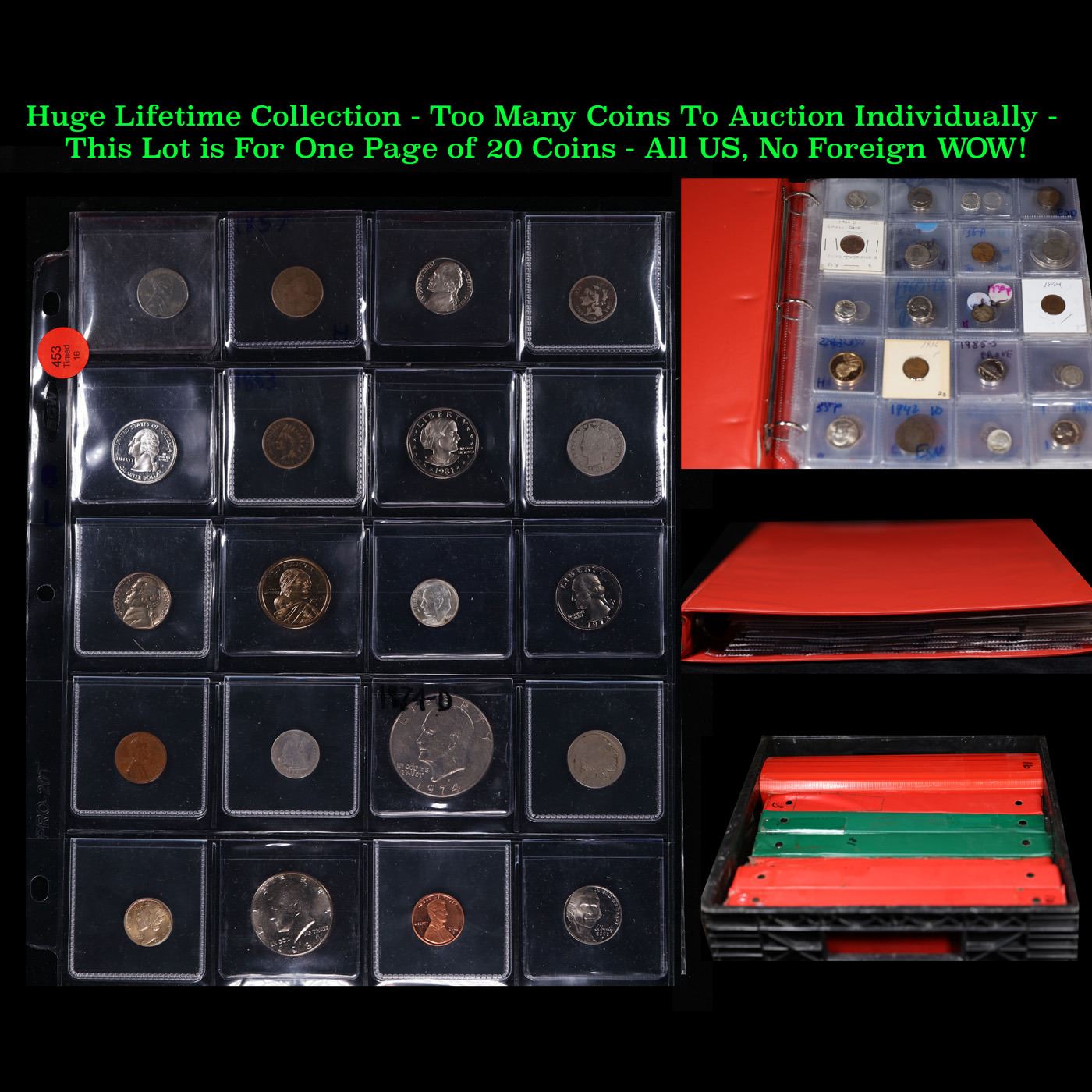 Huge Liifetime Collection - Too Many Coins To Auction Individually - This Lot is For One Page of 20 Coins - All US, No Foreign WOW!. We have received a huge collection of over 10 thousand US coins in flips, 2x2 holders, and 20 coin pages. We are forced, due to limited lots, to sell this collection in pages of 20 coins. All of the pages include Silver Coins. Most contain Indian Cents, Proof Coins, Barber Coinage, Bust Coinage, Lincoln Cents, Flying Eagles, Jefferson Nickels, Roosevelt Dimes, Buffalo Nickels, Eisenhower Dollars, Kennedy Halves, Large Cents including some Draped Bust Large Cents, Mercury Dimes, and Liberty V Nickels. These pages could not be reviewed by anyone in our office due to time constraints. We estimate the value of each page to meet or exceed $200 in value! Good luck and happy hunting.