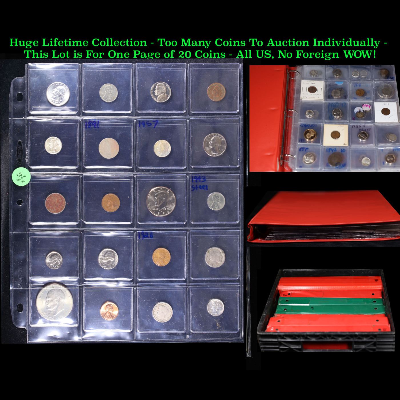 Huge Liifetime Collection - Too Many Coins To Auction Individually - This Lot is For One Page of 20 Coins - All US, No Foreign WOW!. We have received a huge collection of over 10 thousand US coins in flips, 2x2 holders, and 20 coin pages. We are forced, due to limited lots, to sell this collection in pages of 20 coins. All of the pages include Silver Coins. Most contain Indian Cents, Proof Coins, Barber Coinage, Bust Coinage, Lincoln Cents, Flying Eagles, Jefferson Nickels, Roosevelt Dimes, Buffalo Nickels, Eisenhower Dollars, Kennedy Halves, Large Cents including some Draped Bust Large Cents, Mercury Dimes, and Liberty V Nickels. These pages could not be reviewed by anyone in our office due to time constraints. We estimate the value of each page to meet or exceed $200 in value! Good luck and happy hunting.