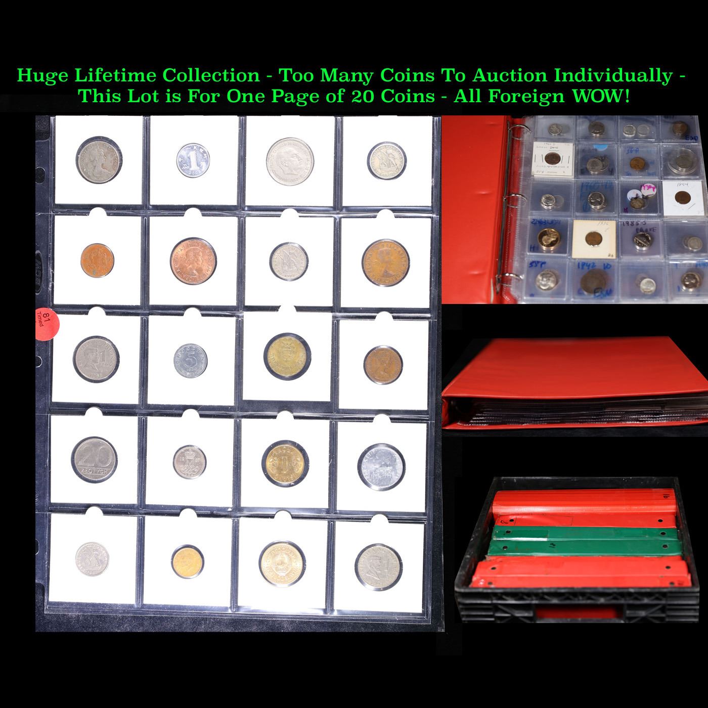 Huge Liifetime Collection - Too Many Coins To Auction Individually - This Lot is For One Page of 20 Foreign Coins. We have received a huge collection of over 10 thousand US coins in flips, 2x2 holders, and 20 coin pages. We are forced, due to limited lots, to sell this collection in pages of 20 coins. All of the pages include Silver Coins. Most contain Indian Cents, Proof Coins, Barber Coinage, Bust Coinage, Lincoln Cents, Flying Eagles, Jefferson Nickels, Roosevelt Dimes, Buffalo Nickels, Eisenhower Dollars, Kennedy Halves, Large Cents including some Draped Bust Large Cents, Mercury Dimes, and Liberty V Nickels. These pages could not be reviewed by anyone in our office due to time constraints. We estimate the value of each page to meet or exceed $200 in value! Good luck and happy hunting.