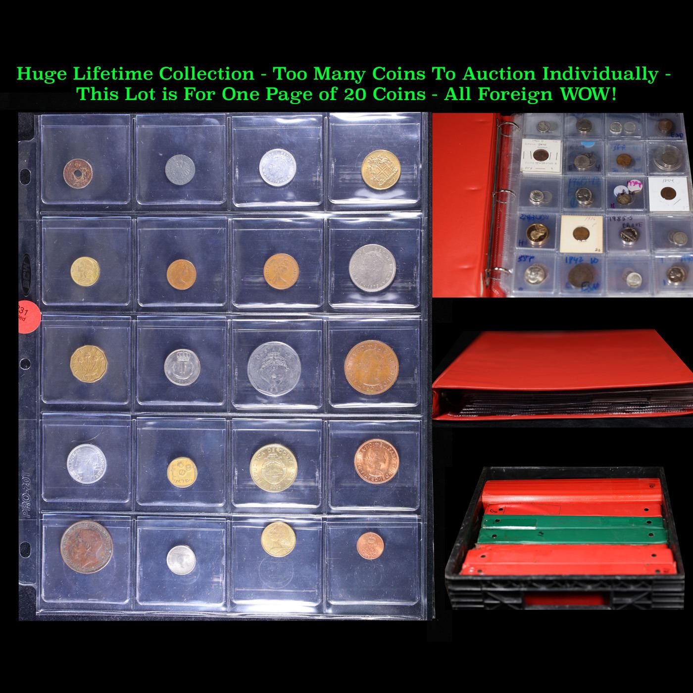 Huge Liifetime Collection - Too Many Coins To Auction Individually - This Lot is For One Page of 20 Foreign Coins. We have received a huge collection of over 10 thousand US coins in flips, 2x2 holders, and 20 coin pages. We are forced, due to limited lots, to sell this collection in pages of 20 coins. All of the pages include Silver Coins. Most contain Indian Cents, Proof Coins, Barber Coinage, Bust Coinage, Lincoln Cents, Flying Eagles, Jefferson Nickels, Roosevelt Dimes, Buffalo Nickels, Eisenhower Dollars, Kennedy Halves, Large Cents including some Draped Bust Large Cents, Mercury Dimes, and Liberty V Nickels. These pages could not be reviewed by anyone in our office due to time constraints. We estimate the value of each page to meet or exceed $200 in value! Good luck and happy hunting.