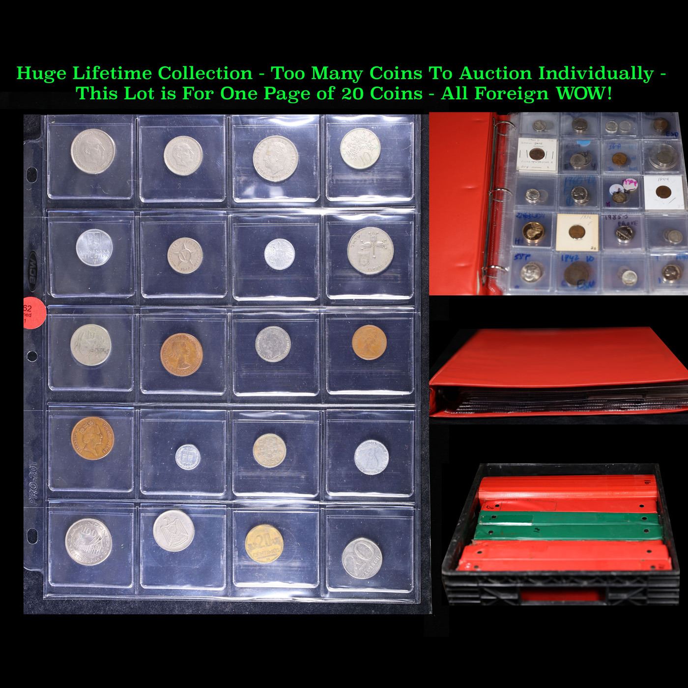 Huge Liifetime Collection - Too Many Coins To Auction Individually - This Lot is For One Page of 20 Foreign Coins. We have received a huge collection of over 10 thousand US coins in flips, 2x2 holders, and 20 coin pages. We are forced, due to limited lots, to sell this collection in pages of 20 coins. All of the pages include Silver Coins. Most contain Indian Cents, Proof Coins, Barber Coinage, Bust Coinage, Lincoln Cents, Flying Eagles, Jefferson Nickels, Roosevelt Dimes, Buffalo Nickels, Eisenhower Dollars, Kennedy Halves, Large Cents including some Draped Bust Large Cents, Mercury Dimes, and Liberty V Nickels. These pages could not be reviewed by anyone in our office due to time constraints. We estimate the value of each page to meet or exceed $200 in value! Good luck and happy hunting.