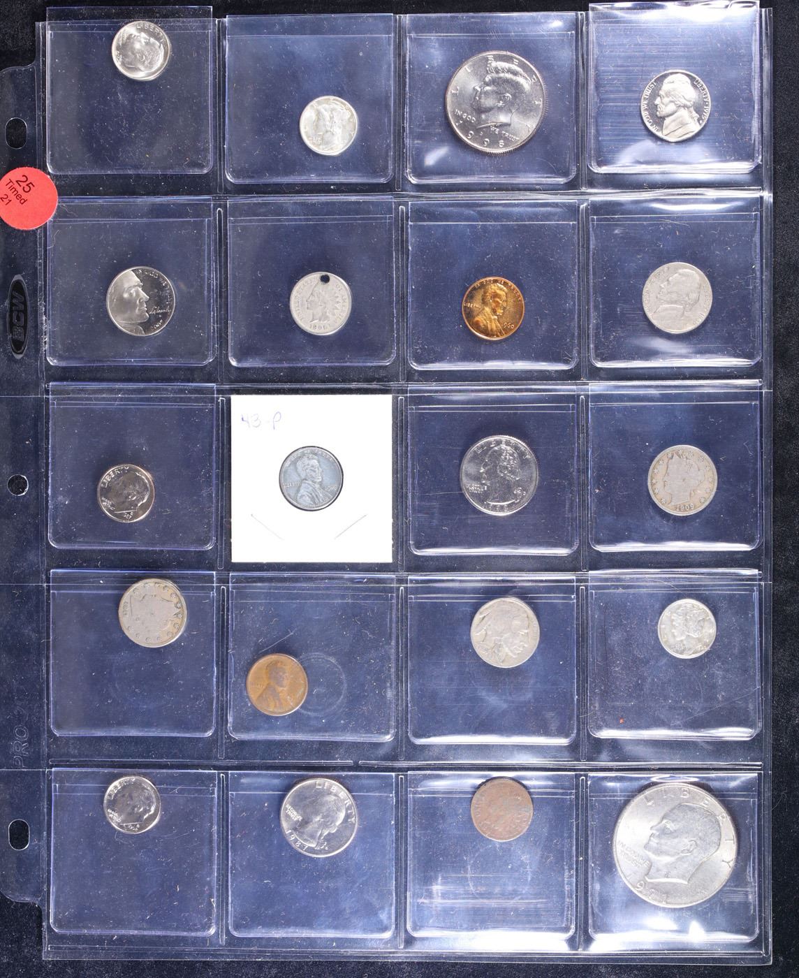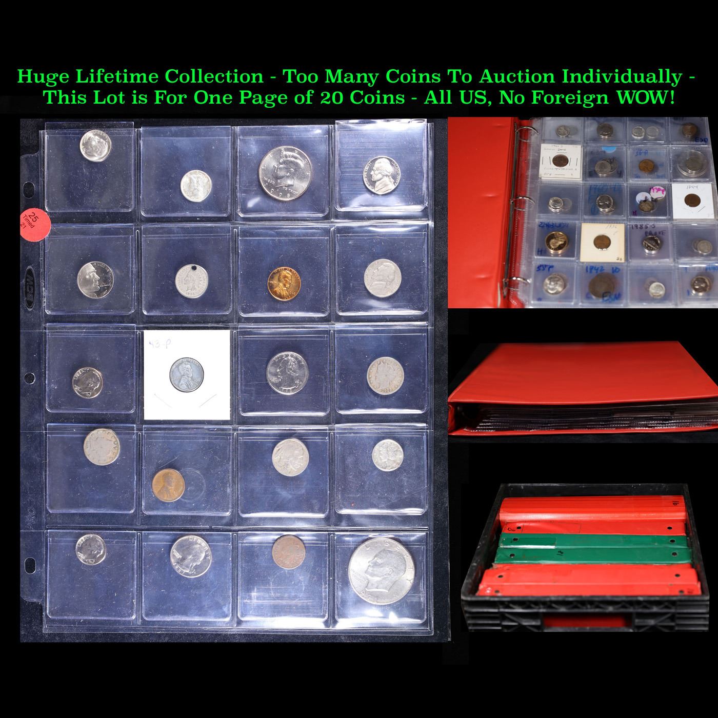 Huge Liifetime Collection - Too Many Coins To Auction Individually - This Lot is For One Page of 20 Coins - All US, No Foreign WOW!. We have received a huge collection of over 10 thousand US coins in flips, 2x2 holders, and 20 coin pages. We are forced, due to limited lots, to sell this collection in pages of 20 coins. All of the pages include Silver Coins. Most contain Indian Cents, Proof Coins, Barber Coinage, Bust Coinage, Lincoln Cents, Flying Eagles, Jefferson Nickels, Roosevelt Dimes, Buffalo Nickels, Eisenhower Dollars, Kennedy Halves, Large Cents including some Draped Bust Large Cents, Mercury Dimes, and Liberty V Nickels. These pages could not be reviewed by anyone in our office due to time constraints. We estimate the value of each page to meet or exceed $200 in value! Good luck and happy hunting.
