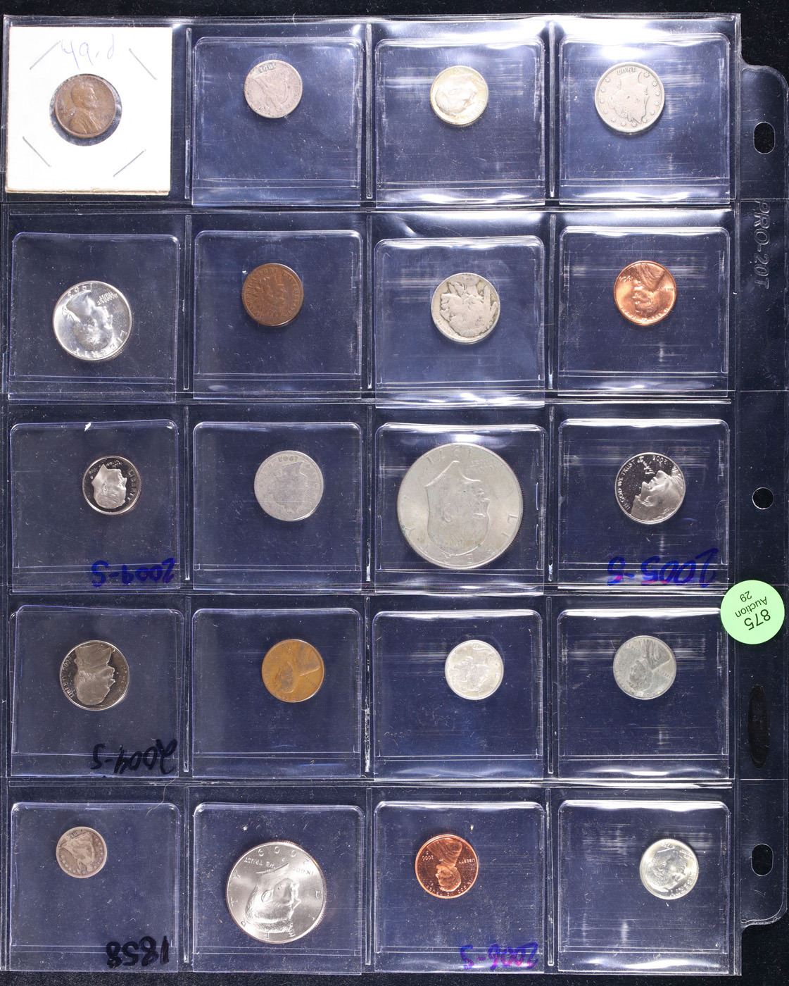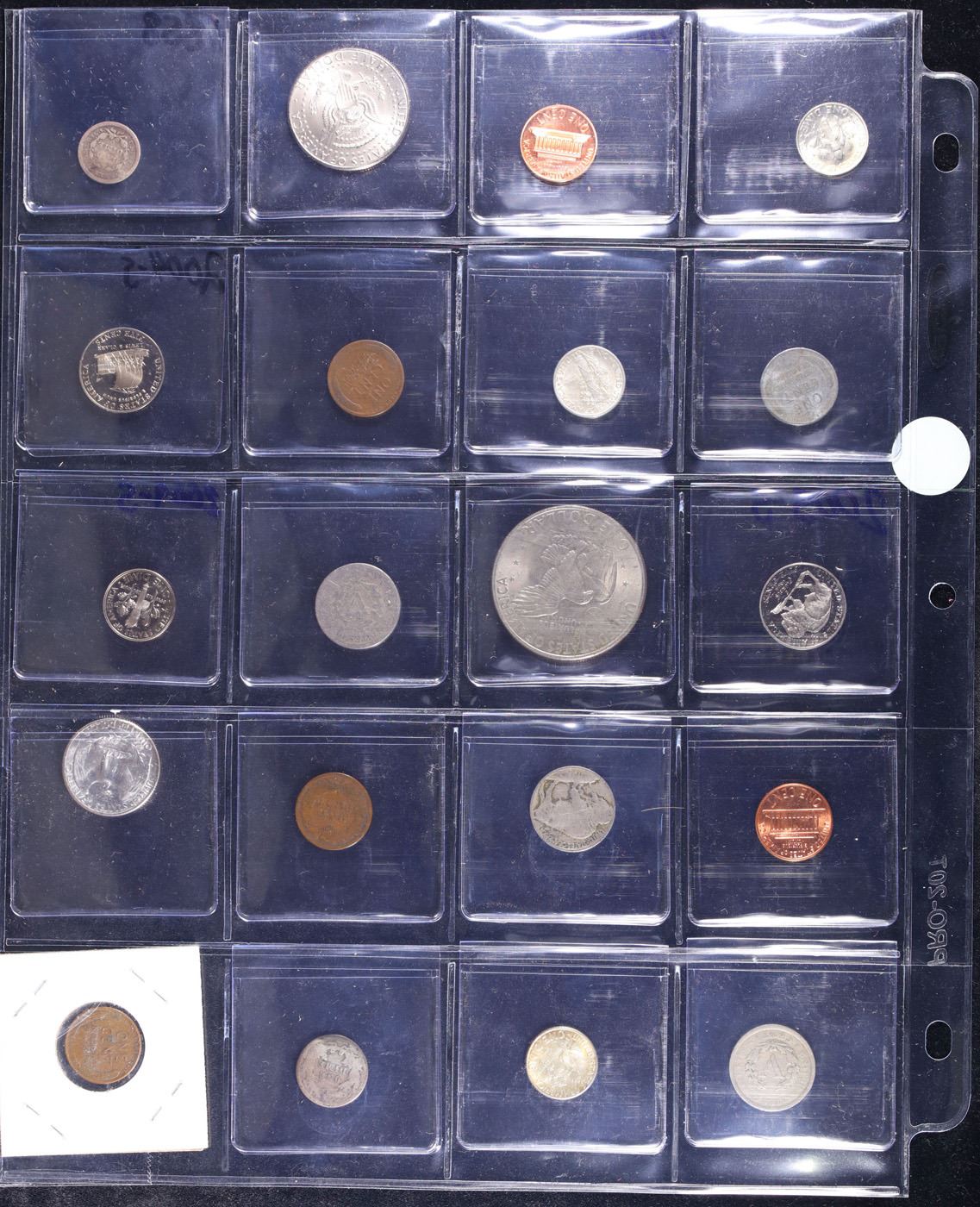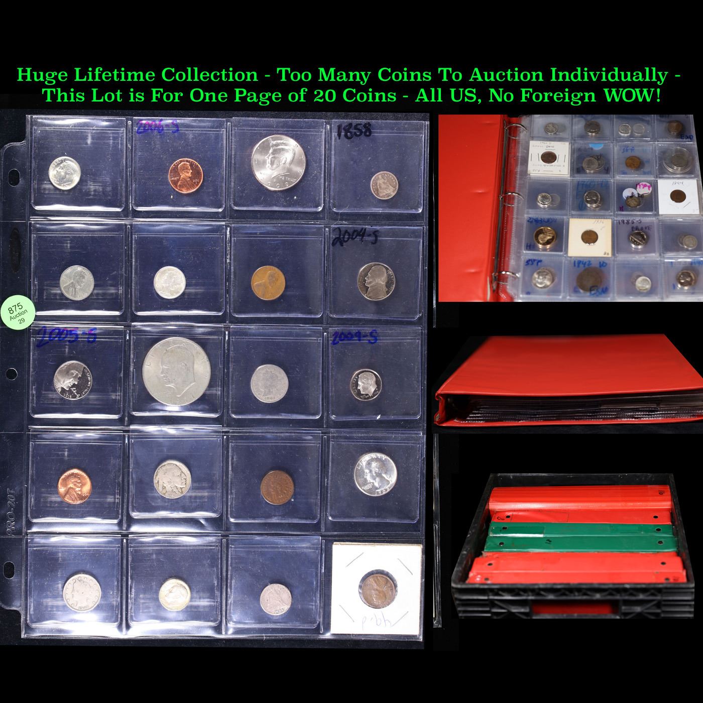 Huge Liifetime Collection - Too Many Coins To Auction Individually - This Lot is For One Page of 20 Coins - All US, No Foreign WOW!. We have received a huge collection of over 10 thousand US coins in flips, 2x2 holders, and 20 coin pages. We are forced, due to limited lots, to sell this collection in pages of 20 coins. All of the pages include Silver Coins. Most contain Indian Cents, Proof Coins, Barber Coinage, Bust Coinage, Lincoln Cents, Flying Eagles, Jefferson Nickels, Roosevelt Dimes, Buffalo Nickels, Eisenhower Dollars, Kennedy Halves, Large Cents including some Draped Bust Large Cents, Mercury Dimes, and Liberty V Nickels. These pages could not be reviewed by anyone in our office due to time constraints. We estimate the value of each page to meet or exceed $200 in value! Good luck and happy hunting.